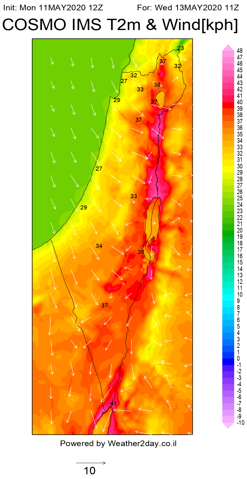 צפי טמפרטורות מודל קוסמו לשעות הצהריים של יום רביעי
