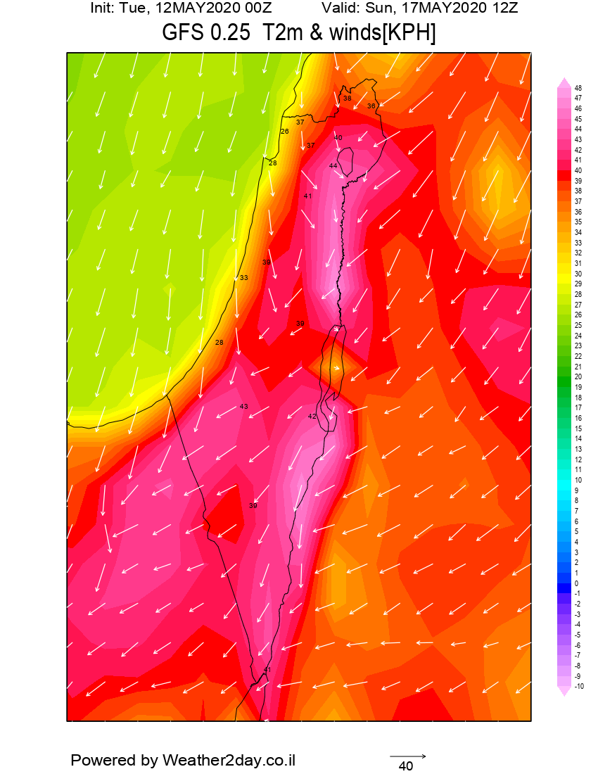 צפי טמפרטורות מודל GFS לשעות הצהריים של יום ראשון בצבעים הורודים איזורים שיעברו את ה-40 מעלות.