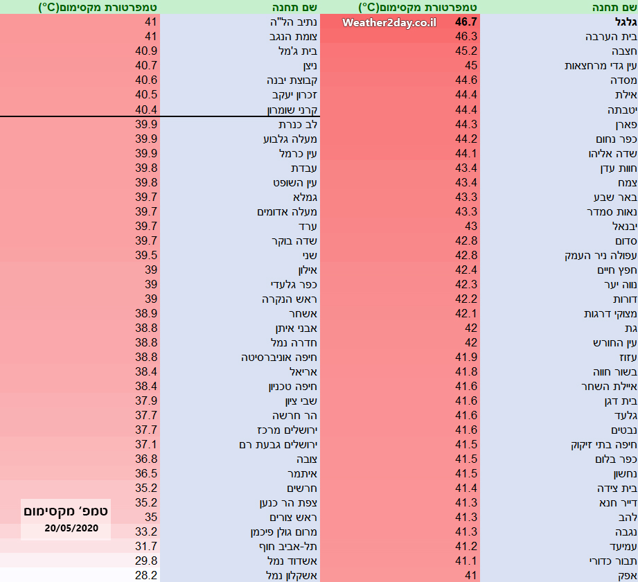 - טבלת שיאי טמפרטורות, היום הרביעי 19.05.2020