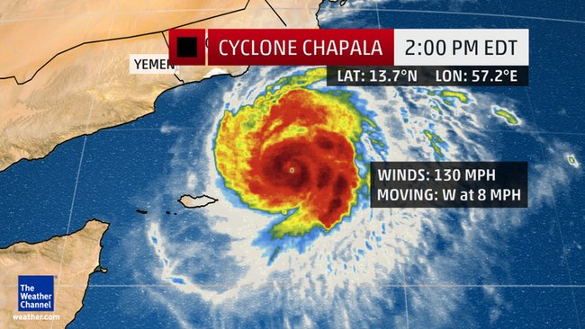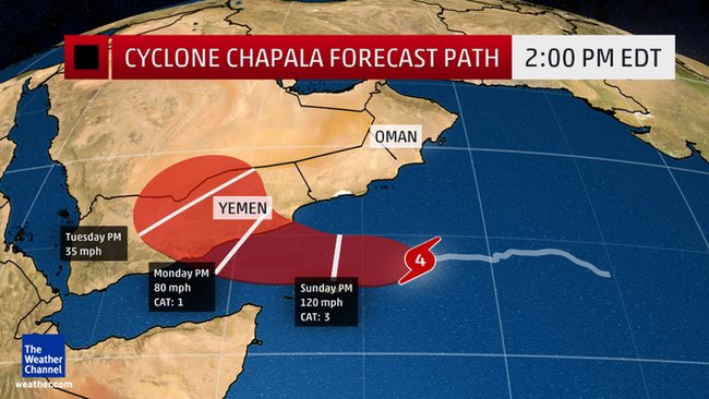 ציקלון Chapala (שאפאלה, צ'אפלה) הפכה לסופה הטרופית החזקה ביותר עד כה בים הערבי, בשיא היא צפויה לפגוע בחוף הדרומי של תימן ביום שני או שלישי, הצפי הוא לרוחות עזות וגשמים כבדים במדבריות הרחוקות של המזרח התיכון.
