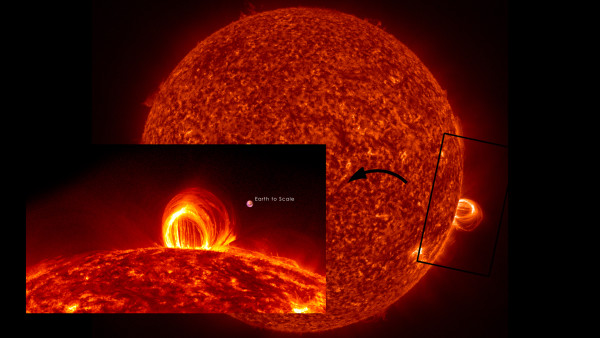 2. קשתות סולאריות הנמתחות מעל פני השטח של השמש, לשם השוואה, מצורפת תמונה של כדור הארץ לטובת קנה מידה.