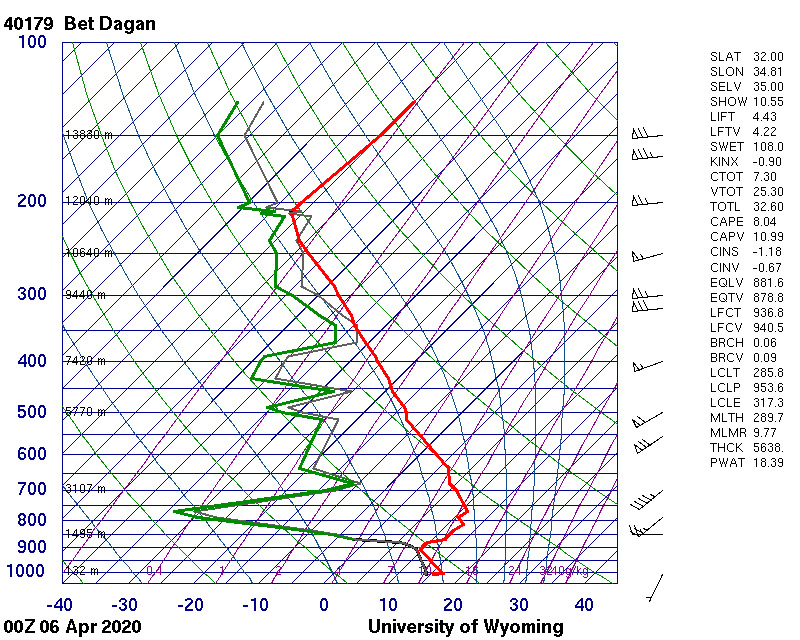 הנה דוגמא לדיאגרמה בה אפשר לראות את נתוני הסונדה לשעה מסויימת, במקרה הזה אנחנו צופים בסונדה של בית דגן, עבור ה-6 באפריל 2020, בשעה 00Z עם עריכה קלה שלנו על מנת להדגיש מספר דברים בדיאגרמה.