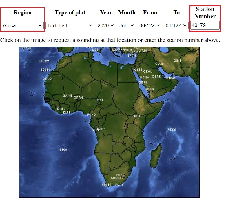 על מנת להוציא את המידע עבור בית דגן, יש לבחור בשדה Region (איזור) את Africa, לבחור את תאריך הזמן הרצוי ואת סוג המידע שרוצים לקבל (בתמונה או בטבלה) ולאחר מכן בשדה האחרון (Station number) להזין 40179 שזהו מספר התחנה של בית דגן. כך זה נראה: