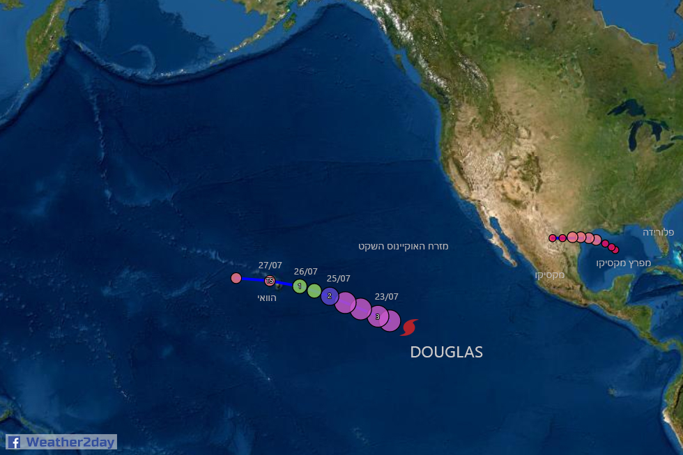 הוריקן דאגלס, שהתפתח במזרח האוקיינוס השקט, נמצא כעת בדרגה 3 ונע במגמה מערבה לכיוון הוואי, הוא צפויה להיחלש משמעותית לקראת הגעתו לאי בסביבות יום שבת. אין אזהרות מיוחדות בשלב זה.