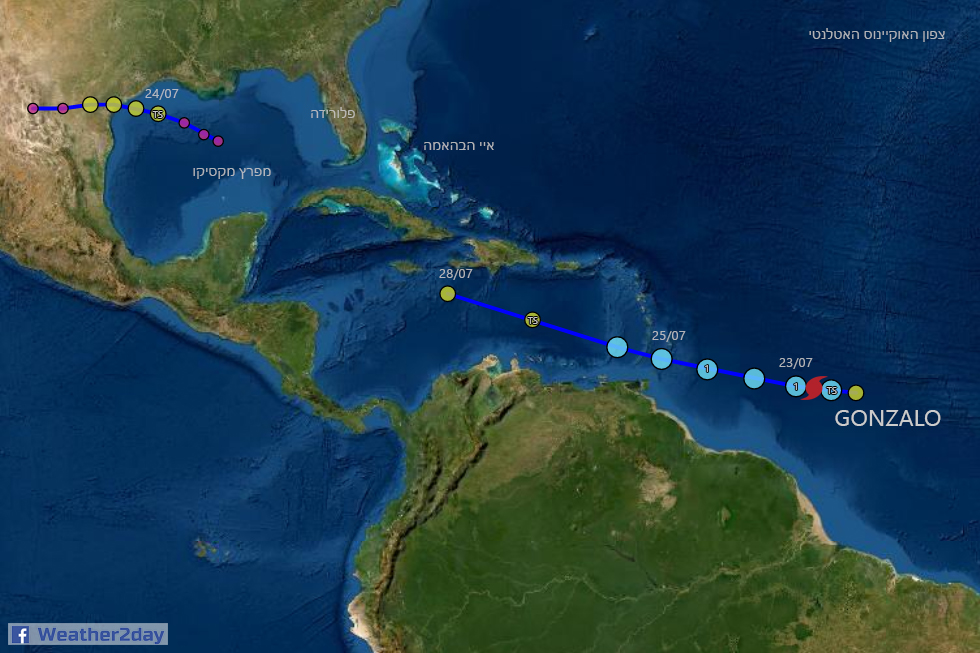 הסערה הטרופית "גונזלו" שבה נתמקד בעדכון זה בשל רמת העניין וההשפעה על בני האדם, צפויה להתפתח לדרגת הוריקן במהלך השעות הבאות. הסערה שהופיעה מצפון לחופי ברזיל נעה במגמה מערבה לעבר האיים האנטילים ומסלולה צפויה לעבור מדרום לרפובליקה הדומיניקנית ודרך ג'יימקה השוכנת לחופי הים הקריבי.