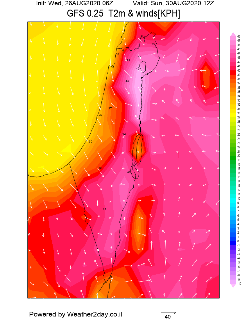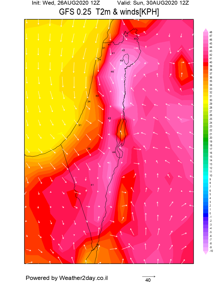 עדכון גל חום 20:50 26/08/2020 צפי מעודכן של המודל האמריקאי ליום ראשון - 49° בטבריה, 46° בעפולה, 45° בצפת ו-50° בבקעת בית שאן. צפי קיצוני לכל הדעות לטווח קרוב יחסית.