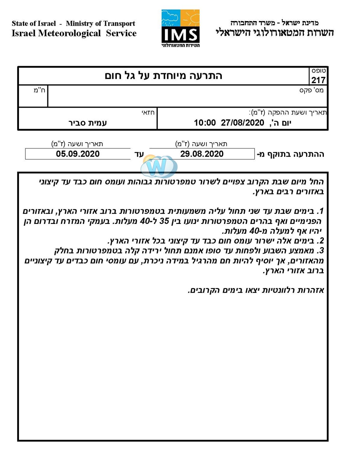 עדכון 11:55 27/08/2020 השירות המטאורולוגי הוציא התרעה על גל חום