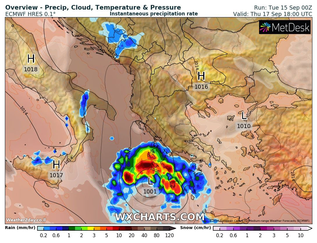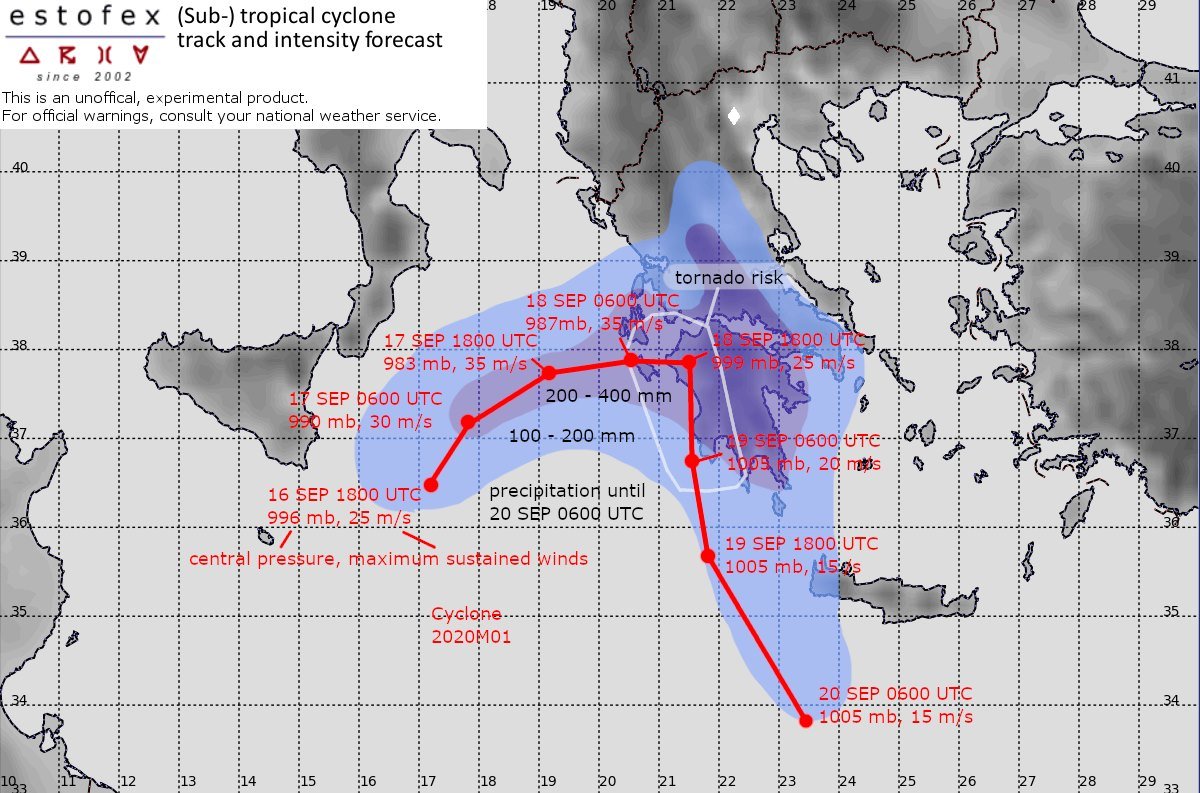 עדכון 17.09.2020 01:30 נתיב הסופה המעודכן. צפי משקעים משמעותי עבור חצי האי פלופונסוס שבדרום יוון. סכנת הצפות משמעותיות אם התחזית תתממש. צפי המודל המוביל לאירופה מדבר על 200-300 מ"מ.