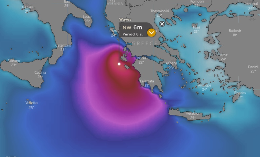 עדכון 17.09.2020 14:10 התחזית לאיי יוון המערביים (האיים היונים) צופה גלים שיפגעו בחוף בגובה 4 מ' לפחות, בקרבת החופים יותר מ-6 מ'. זה הצפי ליום שישי בבוקר: