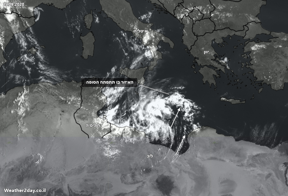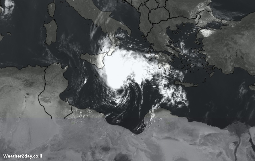 עדכון 16.09.2020 18:35 אנימציית הלווין המעודכנת ליום זה (באור יום). "קסילדה" ממשיכה לצבור אנרגיה ומתחזקת במרכז הים התיכון. ניתן להבחין בתנועה הסיבובית שנוצרת סביב השקע.