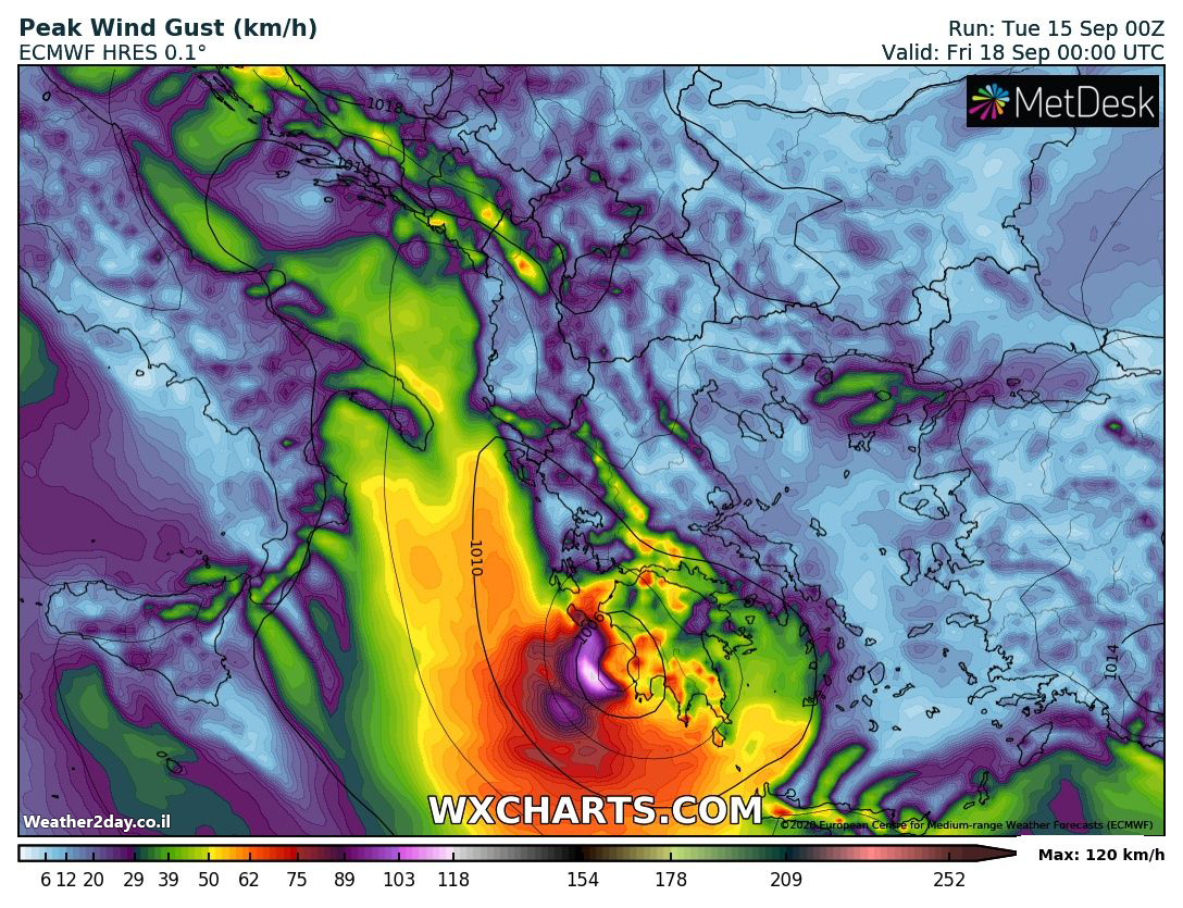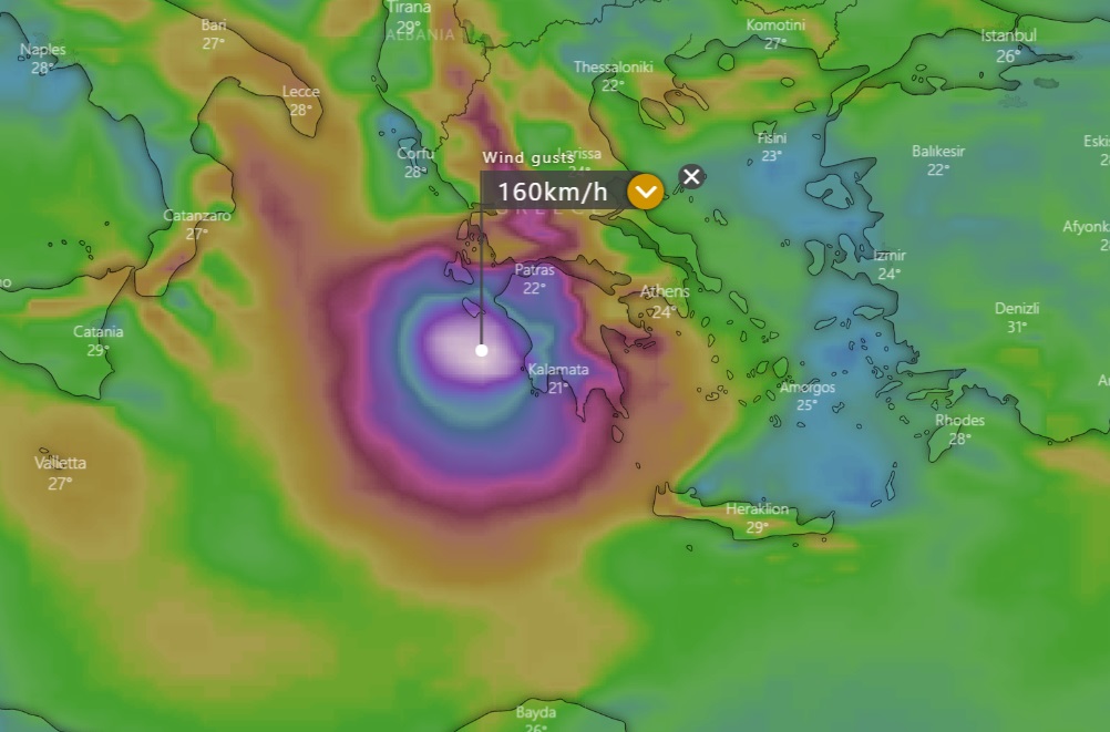 עדכון 16.09.2020 11:55 המודל המוביל החמיר את הצפי הבוקר, על פי העדכון האחרון לקראת הפגיעה ביבשה עוצמת משבי הרוח של הסופה עלולים להגיע ל-160 קמ"ש ואף יותר - רוחות בעוצמה של הוריקן בקטגוריה 2. ביוון מכנים כעת את הסערה בשם Ianos ("יאנוס").