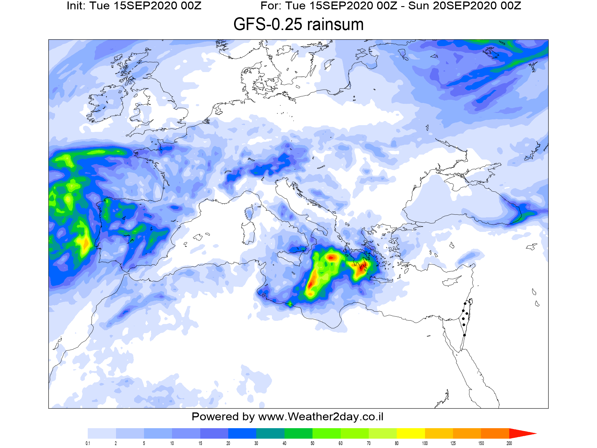 צפי המשקעים לחמישה ימים הבאים, GFS 0.25