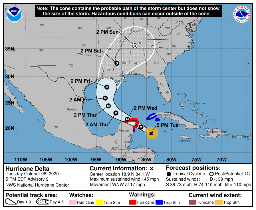 הוריקן "דלתא" (קטגוריה 4) בדרכו למדינת יוקטן השוכנת לחופי מפרץ מקסיקו. טולום, קוזמול, קנקון, פלאיה דל כרמן ועוד מיעדי הנופש הפופולארים של מקסיקו על הכוונת של הסופה הטרופית המסוכנת הזו. במקסיקו החלו למגן את הבתים והעסקים ונערכים לאירוע שנחשב קטסטרופלי בחומרתו. הסופה צפויה להכות במקסיקו תחילה, ובהמשך לנוע לתוך מפרץ מקסיקו לעבר דרום ארה"ב, איזור לואיזיאנה, שככל הנראה תחווה הוריקן עוצמתי נוסף אם הסופה לא תחלש.