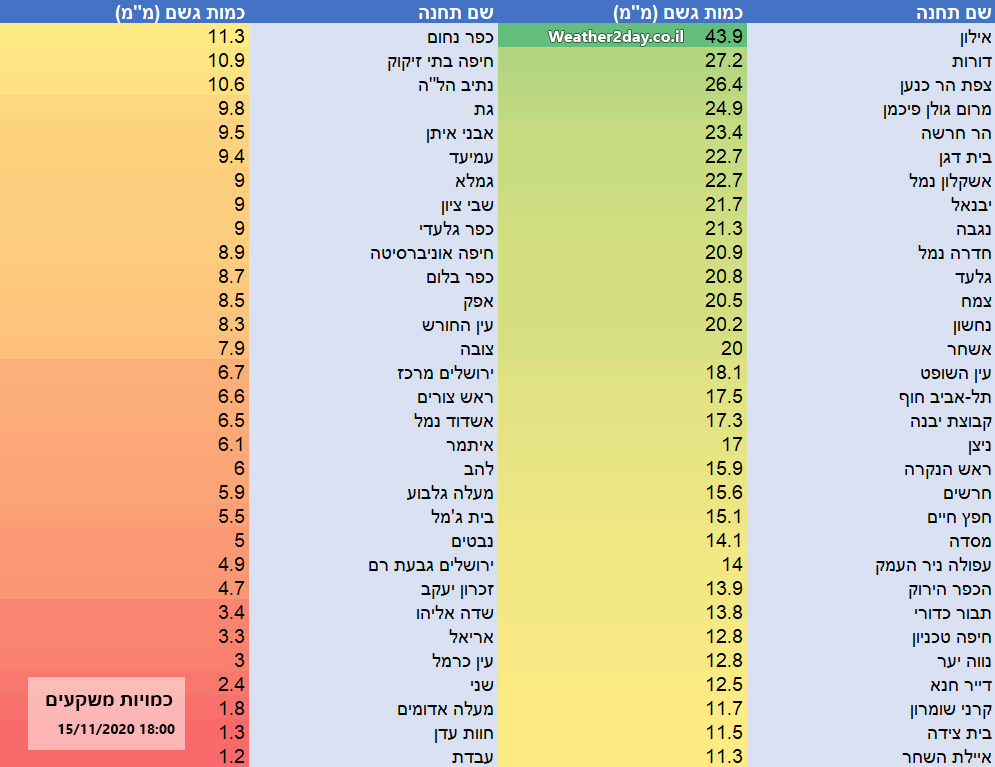 כמות הגשם שירדה ביממה האחרונה (תחנות השירות המטאורולוגי)