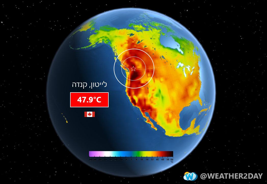 אחרי טמפרטורות קיצוניות שנראו בחודש יוני ברוסיה, זה קורה שוב והפעם במערב קנדה וארצות הברית. בשבועיים האחרונים מדינות ואיזורים נרחבים ברצועת החוף המערבי של ארה"ב חוו גל חום קיצוני אך הפעם הוא שבר גם שיאים: 47.9°C מעלות בלייטון, קנדה ו-48°C מעלות בוושינגטון ואורוגון שבארה"ב.