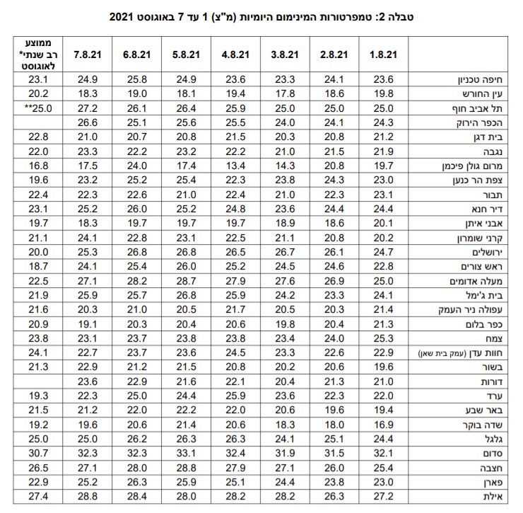 טמפרטורות המינימום היומיות 1 עד 7 באוגוסט