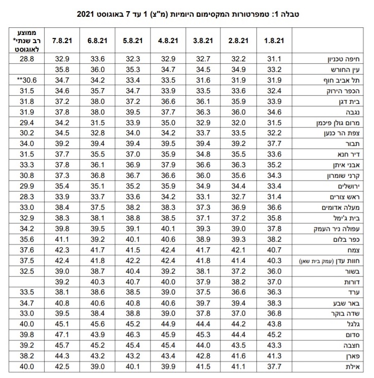 טמפרטורות המקסימום היומיות 1 עד 7 באוגוסט. השירות המטאורולוגי