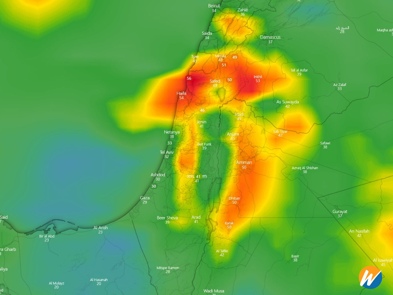 במפה המצורפת למטה אפשר לראות את האיזורים בהם נרגיש את עוצמת הרוח החזקה ביותר (משב הרוח). רמת הגולן, עמקי הצפון, מפרץ חיפה ושדרת ההר יחושו בעוצמות משתנות של רוחות מזרחיות במהלך סוף שבוע הבא. האיזורים הצהובים, כתומים ואדומים הם האיזורים שיושפעו מרוחות חזקות.