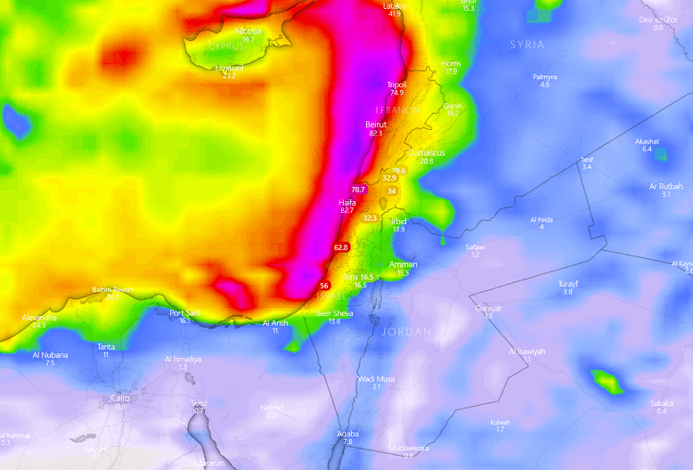 התעמקות אפיק ים סוף ממערב לישראל גורמת לרוחות מזרחיות חזקות באיזורינו. ברוב הפעמים, לא יורדים גשמים משמעותיים באיזורינו במצב סינופטי זה אך הפעם מעט גשם כן הצליח לרדת בשל עננות מפותחת שנוצרה מדרום וממזרח אלינו. בדרום הארץ נמדדו מילימטרים בודדים של גשם וביתר האיזורים חוו טפטוף או גשם קל. בנוסף לרוחות שרר אובך כבד הנגרם בשל חול ואבק שהוסע באוויר מאיזורי המדבריות ממזרח. הרוחות צפויות להירגע החל משעות הצהריים של יום שני.