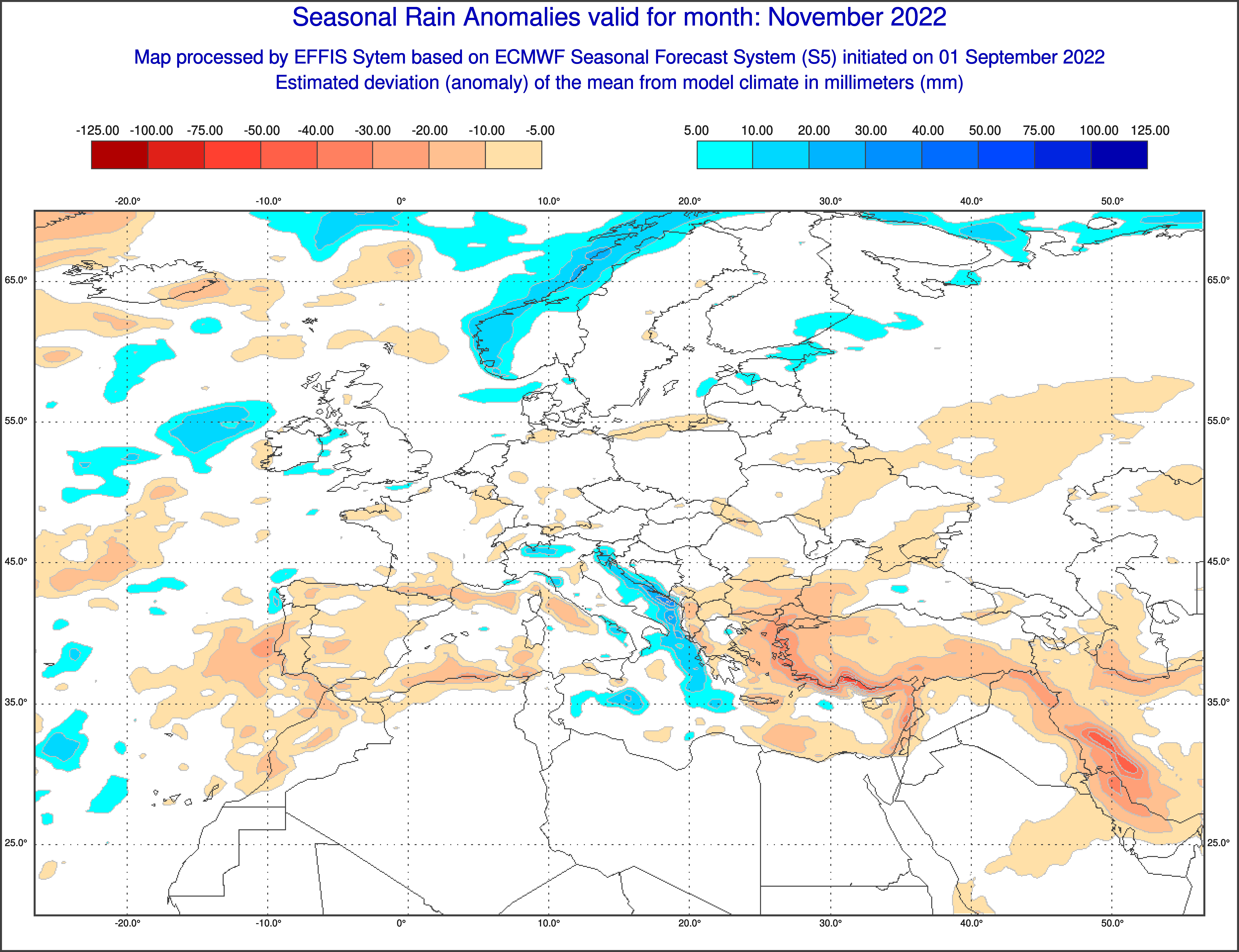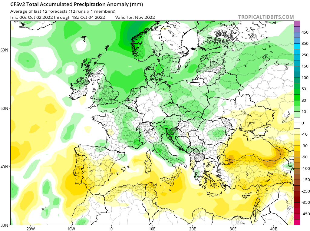 מחכים לגשם שיגיע? הוא יגיע אל תדאגו, רק שעל פי התחזית המעודכנת של CFS ובתמיכת ECMWF הצפי לחודש נובמבר פעיל בעיקר באירופה בעוד מזרח הים התיכון נותר יבש מהממוצע. במפות הבאות צבעי הירוק והתכלת מייצגים חריגות חיובית (למשל, רטוב מהרגיל) וצבעי הצהוב והכתום חריגות שלילית (למשל, יבש מהרגיל). כפי שניתן לראות שיא הסתיו צפוי להיות פעיל במיוחד במערב ומרכז אירופה בעוד החלקים המזרחיים יהיו יבשים מהממוצע. ישראל היא נקודה קטנה מאוד על המפה ביחס לפלט שאנו מקבלים כאן ולכן אפשר רק לבחון את המגמה הכללית באיזורינו שמעידה על נובמבר יבש ברובו.