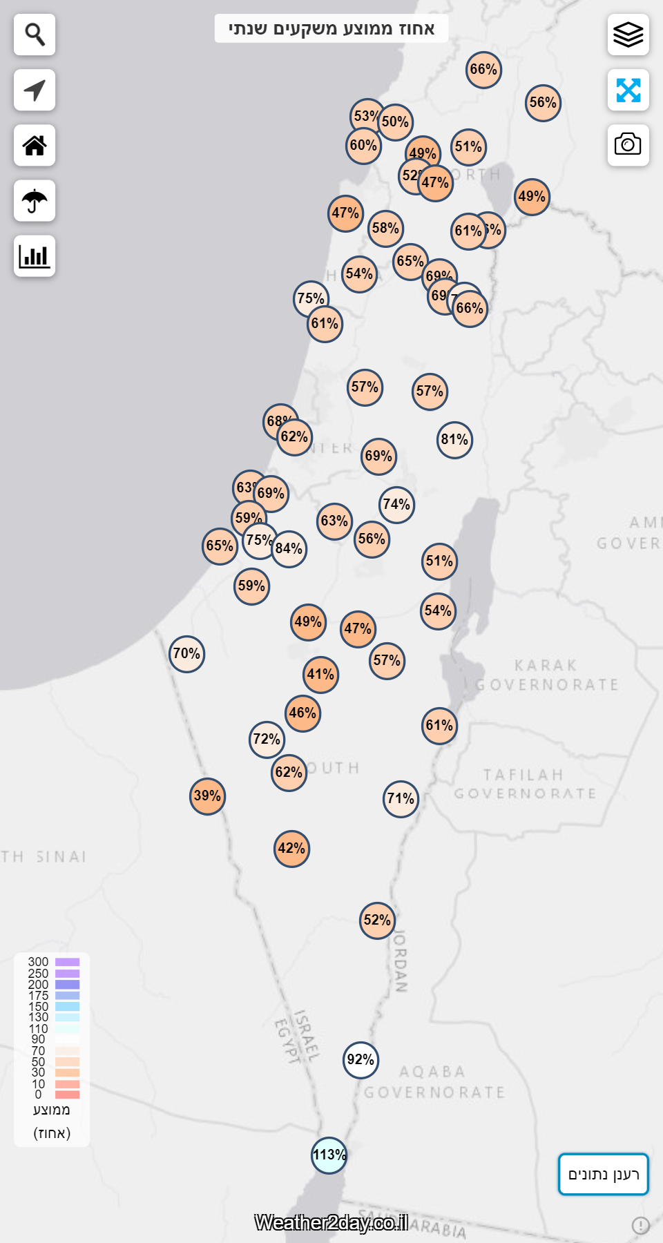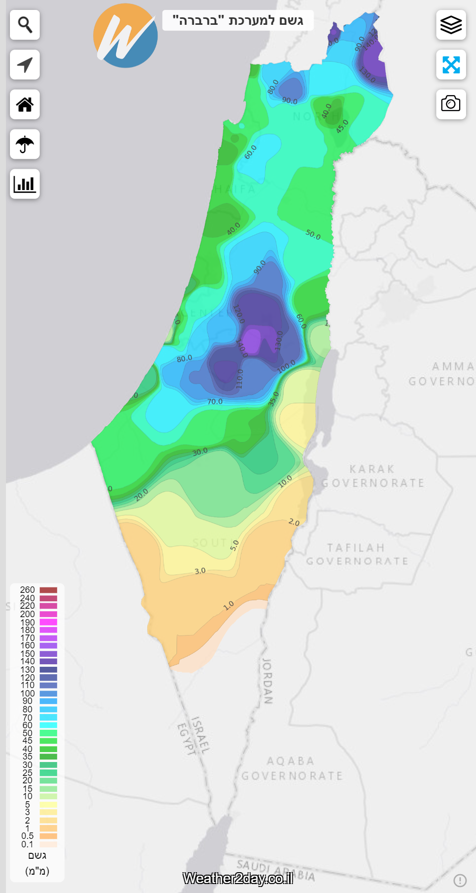 לאחרונה השקנו כלי חדש המיועד למשתמשי פרימיום של האתר המאפשר לצפות בסיכומי המשקעים לפרקי זמן שונים (כולל סיכומים חודשיים ועונתיים). על פי תמונת המצב של מפות החום באזור הרי המרכז נמדדו 100 עד 140 מ"מ של גשם נקודות מסויימות רשמו כמות מפתיעה כמו 111 מ"מ במעלה אדומים. בצפון הגולן והגליל העליון נמדדו בין 80 עד 140 מ"מ ובגליל התחתון, בדרום הגולן, בעמקי הצפון נמדדו 40 עד 70 מ"מ. במישור החוף הצפוני והמרכזי נמדדו 30 עד 50 מ"מ וכמויות גדולות יותר של 60 עד 90 מ"מ נמדדו במישור החוף הדרומי וצפון עוטף עזה. בצפון מערב הנגב, בחבל יתיר ובחבל הבשור ירדו 30 עד 50 מ"מ וכמויות הגשם פחתו דרומה, כך שבצפון הנגב ירדו כ-20 מ"מ, במרכז הנגב 5 עד 10 מ"מ ודרומה משם כמעט ולא ירד גשם.