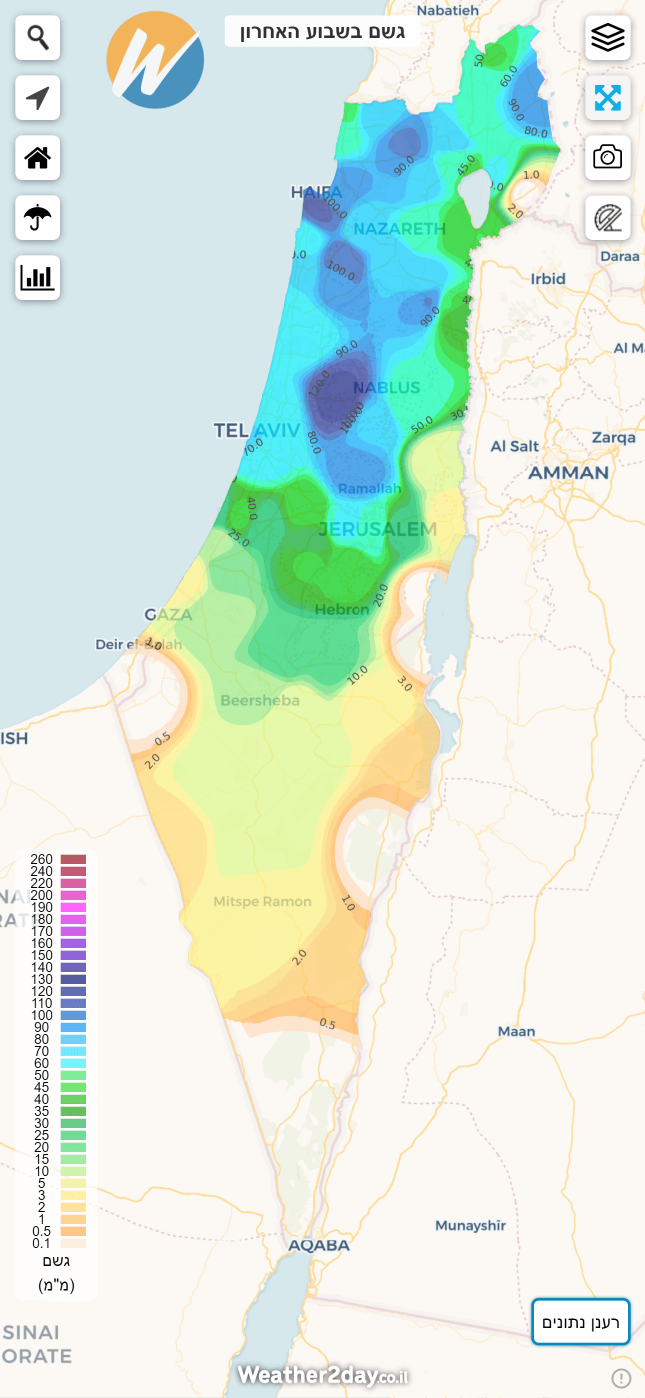 כמויות הגשם שנמדדו בגליל המערבי ובתחנות הצפון הגיעו ל-70 עד 110 מ"מ ואף במקומות מסויימים נמדדו כ-120 מ"מ כמו קרני שומרון וברמת השופט. ביתר האיזורים כמויות של עשרות מ"מ כמו במישור החוף המרכזי והדרומי שגרפו כ- 50 עד 80 מ"מ. מאוחר יותר החלו להצטבר גם ברמת הגולן כמויות סביב ה-100 מ"מ של גשם. בתחנת חרשים נמדדו כ-40 מ"מ של גשם בטווח זמן של חצי שעה בלבד. בדרום הארץ כמויות הגשם היו קטנות יותר – באזור עוטף עזה 20 עד 30 מ"מ, בצפון הנגב 5 עד 10 מ"מ ובאזור ים המלח והערבה פחות מ-3 מ"מ כך על פי השירות המטאורולוגי.