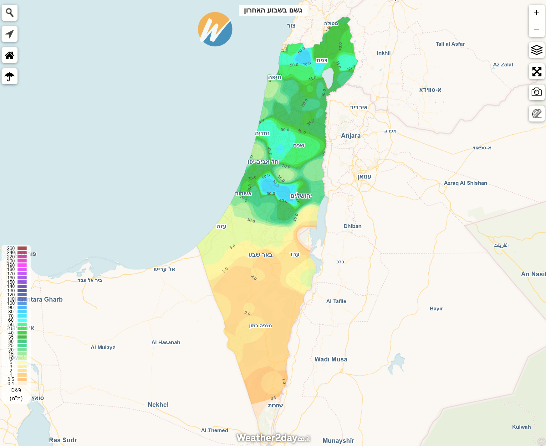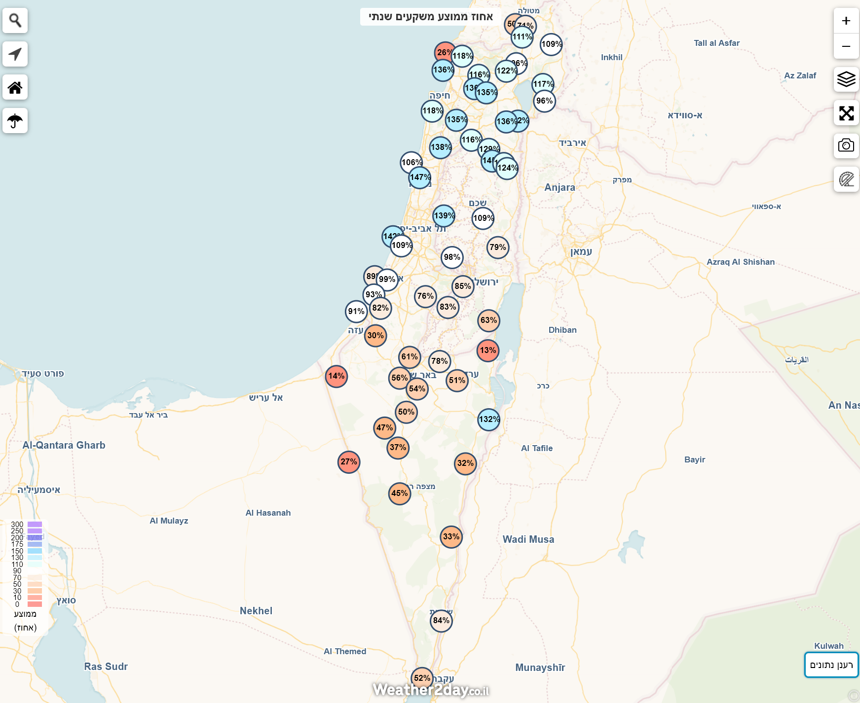 באמצעות מפות הגשם של האתר, אנו מביאים לכם את סיכום המשקעים ואחוז ממוצע המשקעים העונתי, בנוסף, בהמשך הסיכום תוכלו לצפות באנימצית מכם הגשם והלוויין של האירוע.