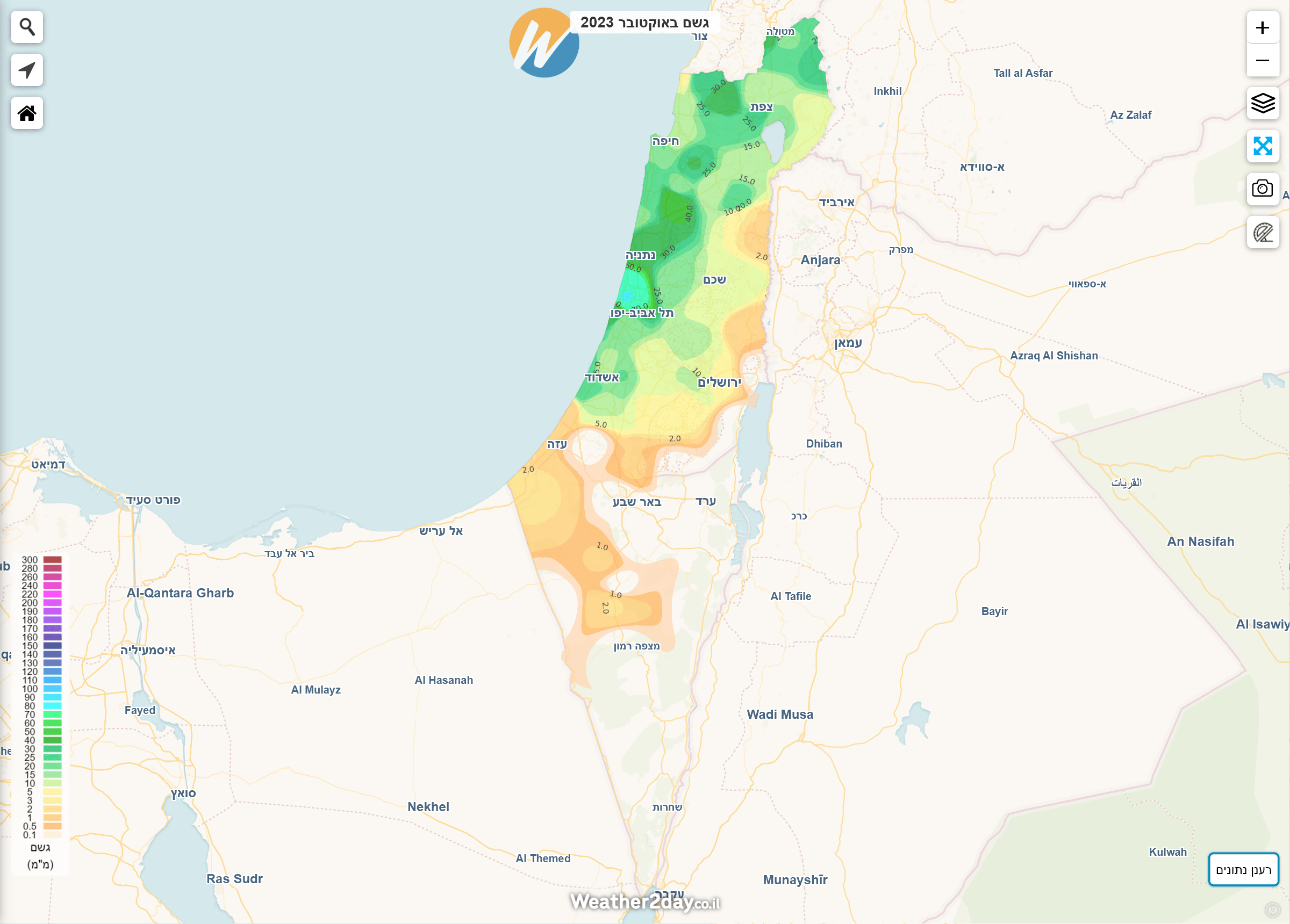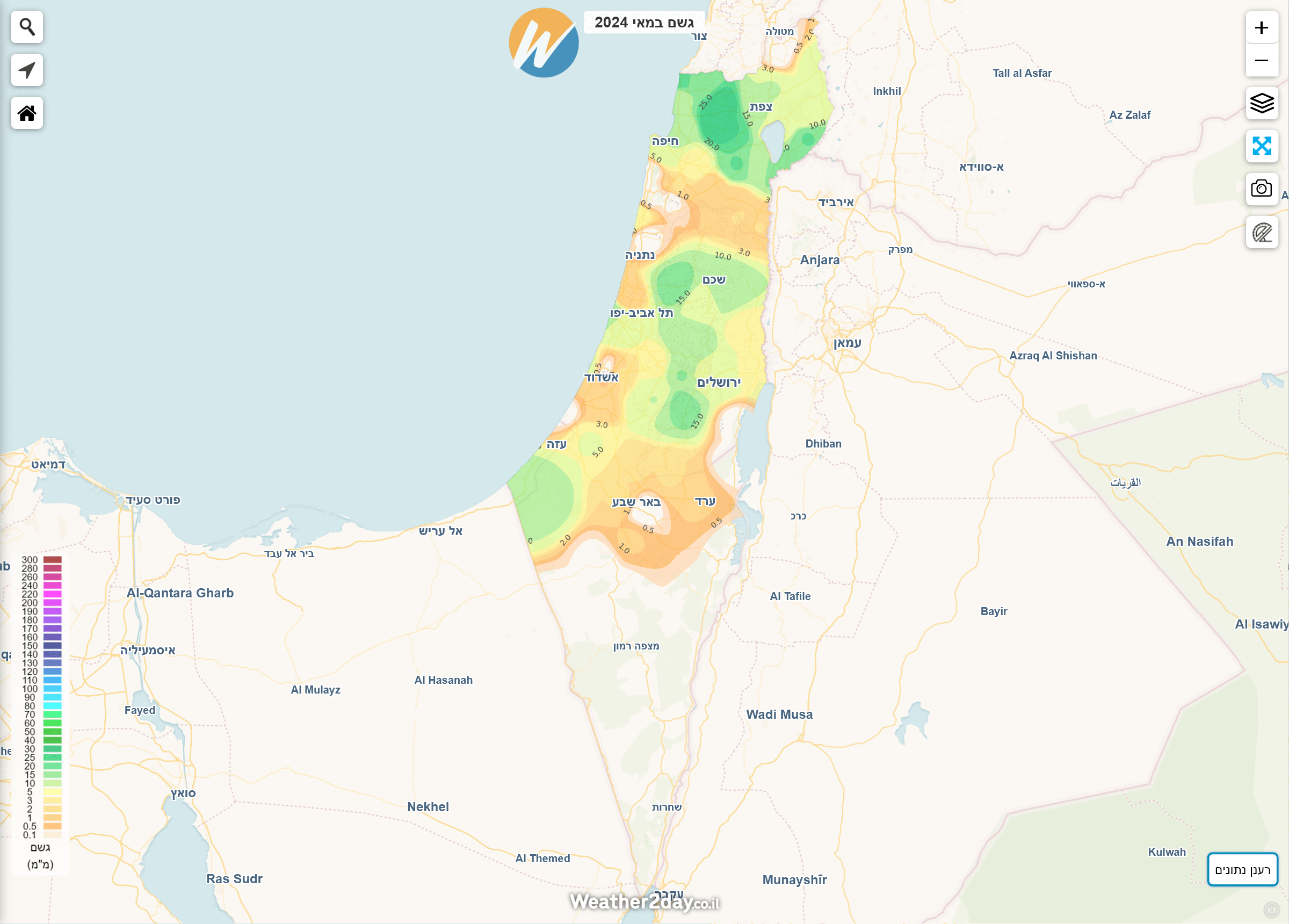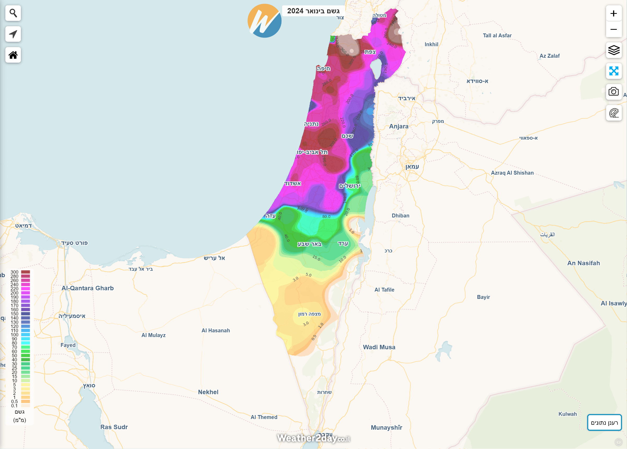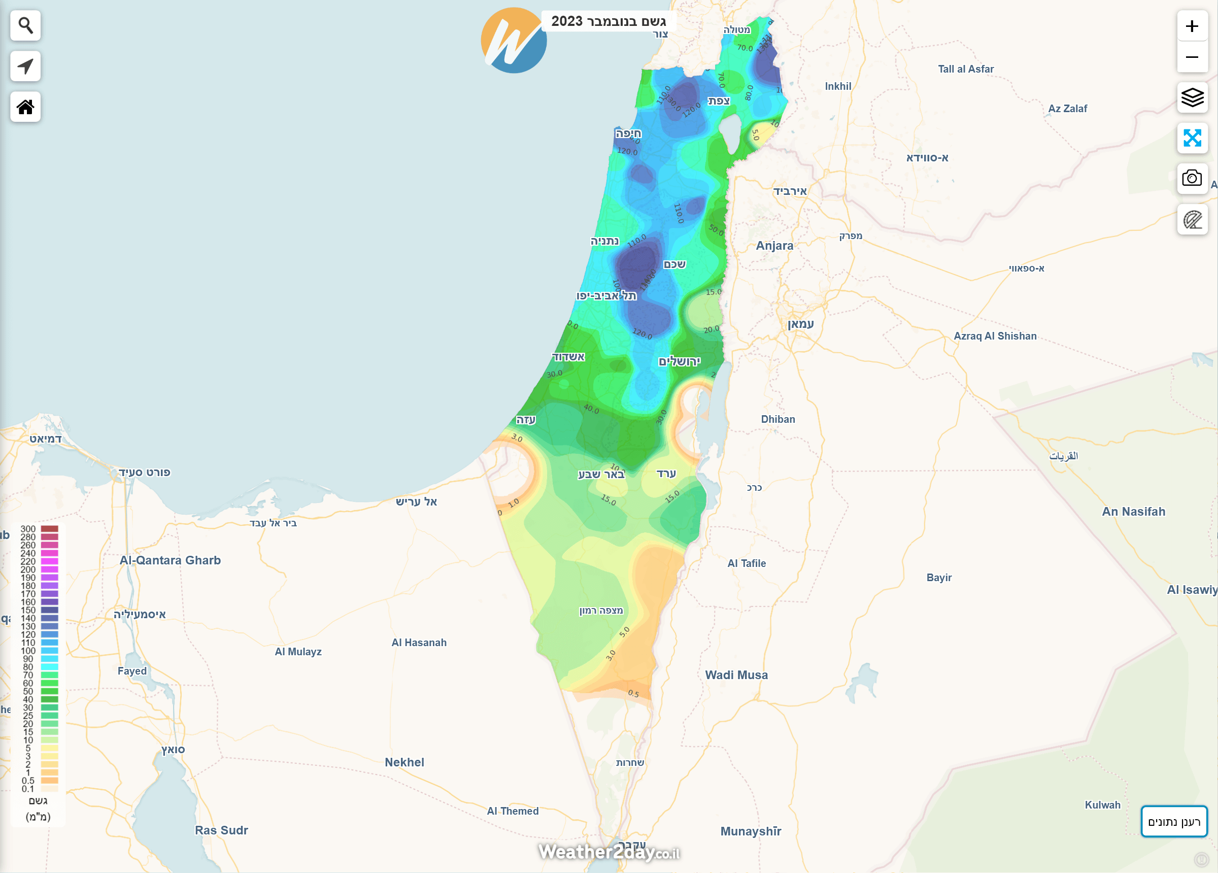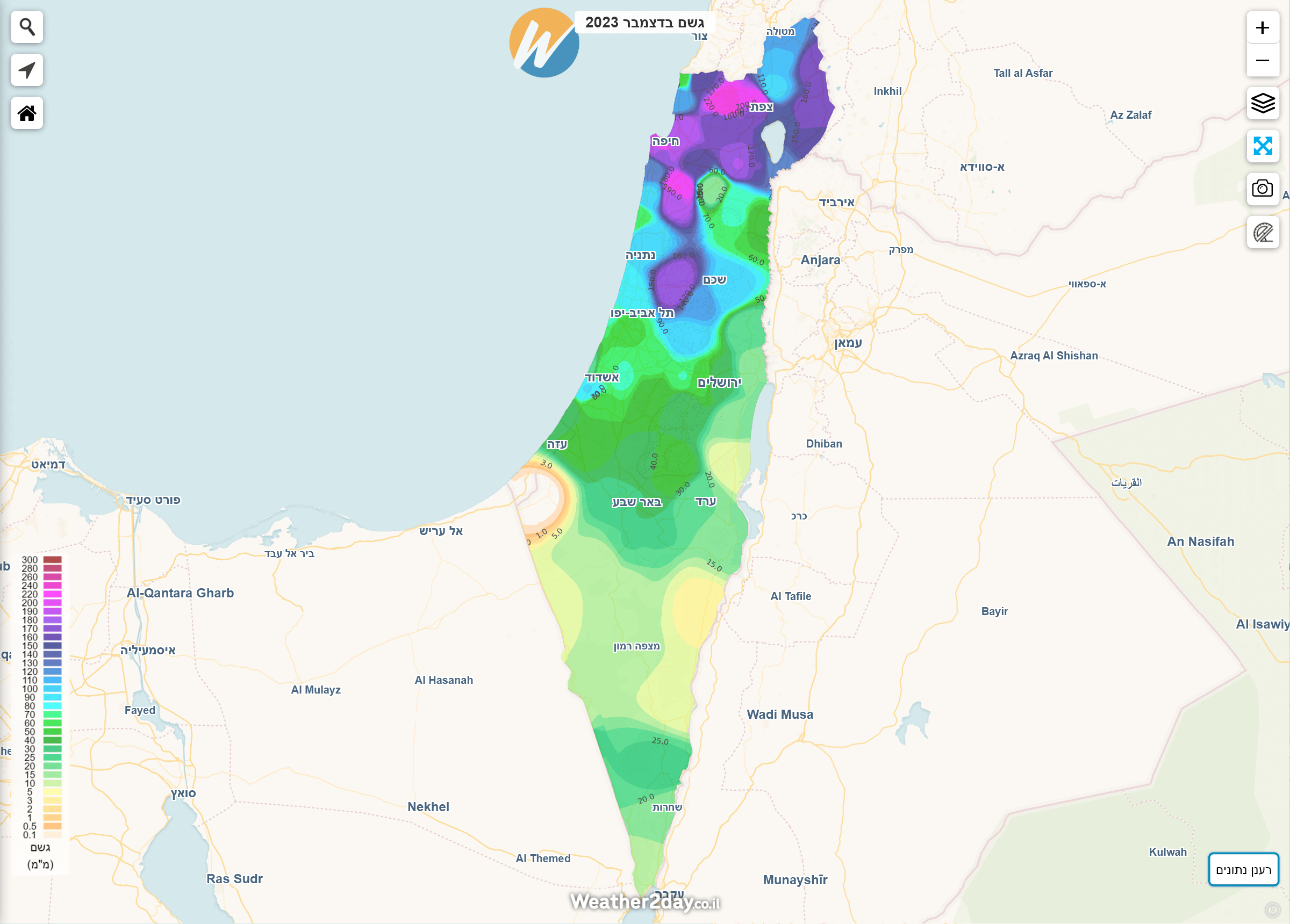 הסיכום הבא משלב נתונים מרכזיים לפי חודש יחד עם מפות חום המציגות את כמויות המשקעים בצורה נוחה יותר על גבי מפה. ניתן לגשת למפות אלו באמצעות מנוי פרימיום דרך תפריט מכם הגשם על מפת מזג האוויר של האתר. בעקבות המלחמה, חלק מנתוני התחנות בצפון הארץ וביישובי העוטף לא מדדו נתוני מזג אוויר במלואם. היות והאלגוריתם הייחודי שבנינו לא "מעגל פינות" ייתכנו חורים בתצוגה באזורים בהם חסרים או לא נמדדו משקעים למרות שבפועל ירד. נקווה שבעונה הבאה כל התחנות יחזרו לפעול במלואן.