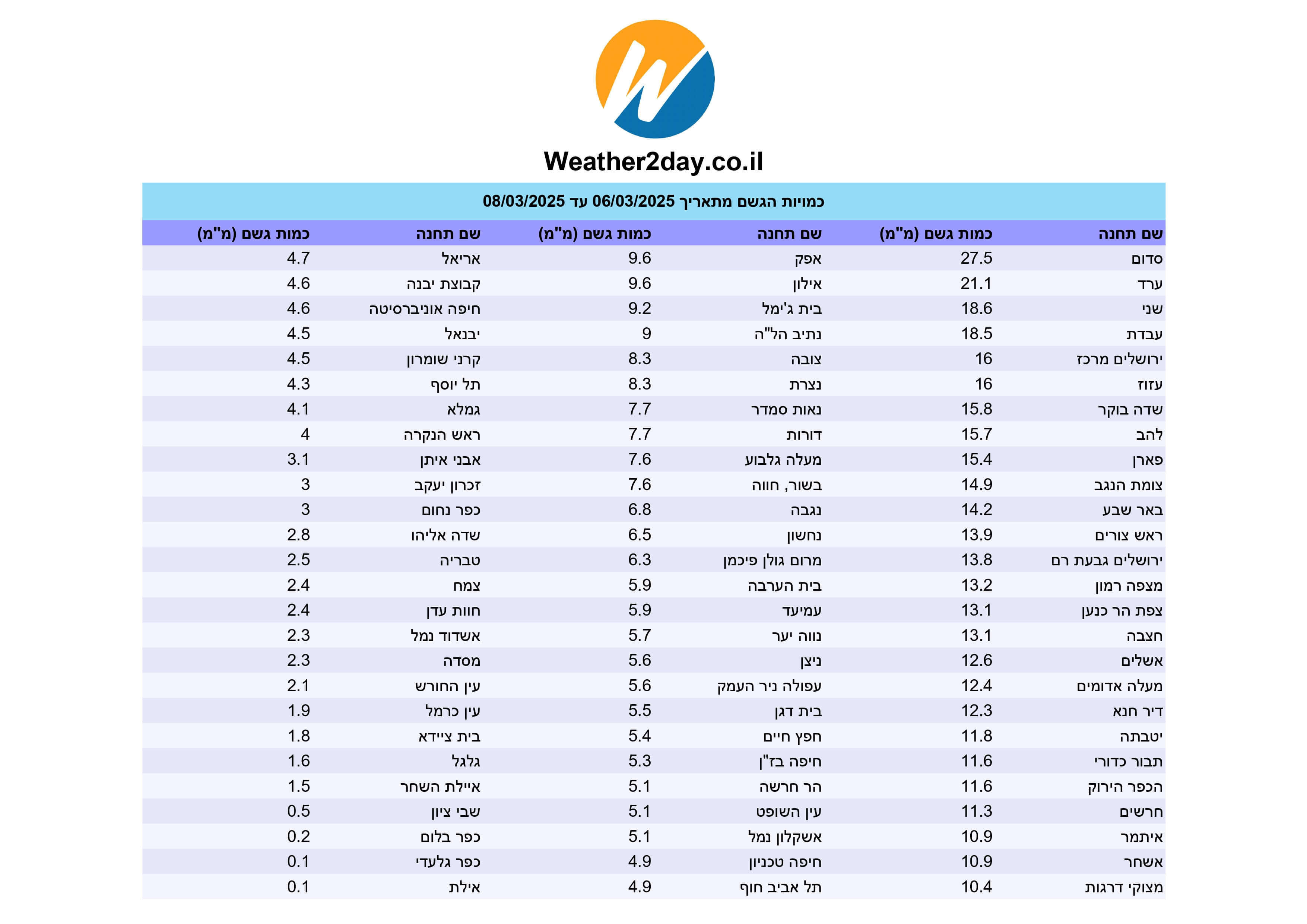 מבחינת כמויות המשקעים, נראה כי הדרום מזנק לכמויות שעשויות לסגור את הממוצע העונתי בחלק מהאזורים. ביממה האחרונה נמדדו בתחנה כ-20 מ"מ גשם, בעוד שהממוצע העונתי עומד על 39 מ"מ. למעשה, בתוך יממה אחת בלבד ירדו כ-51% מכלל כמות המשקעים הממוצעת לעונה כולה בתחנה זו. גם במקומות נוספים נרשמו כמויות גשם משמעותיות – בערד ירדו 20 מ"מ, בירושלים 16 מ"מ, ובמושב פארן בערבה נמדדו 11 מ"מ.
