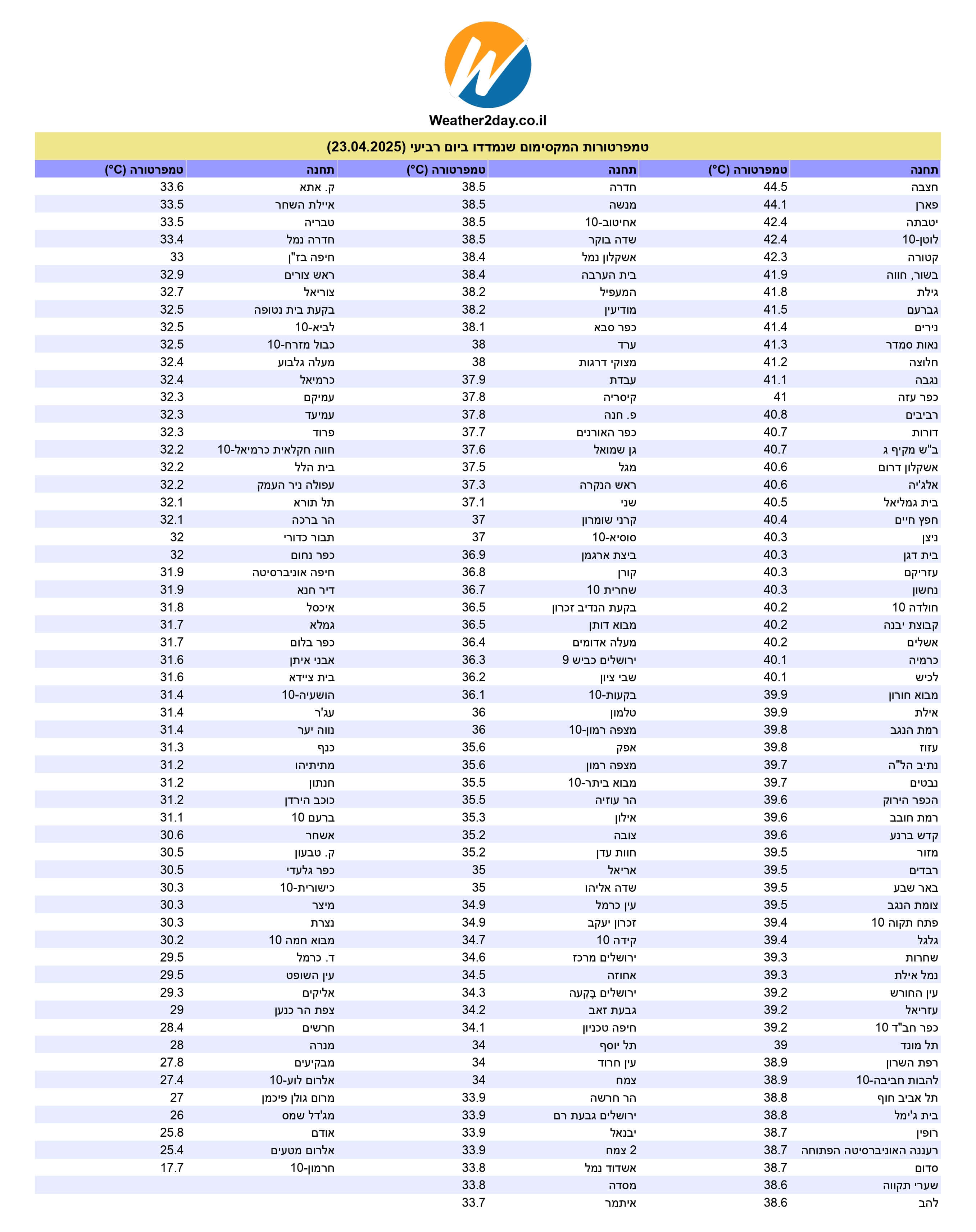 חצבה: 44.9 מעלות (השיא הקודם – 44.2 מעלות משנת 1994)