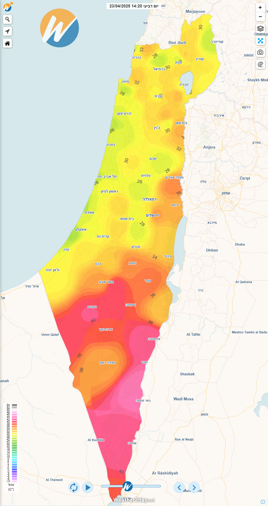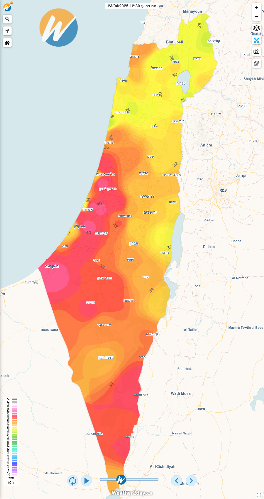 ביום שני, 22 באפריל, החלה עלייה חדה בטמפרטורות. במישור החוף, השפלה ועמקי הצפון נמדדו 36–38 מעלות, בנגב ובעמק הירדן 38–40 מעלות, ובערבה המרכזית והצפונית נרשמו 42–44 מעלות.