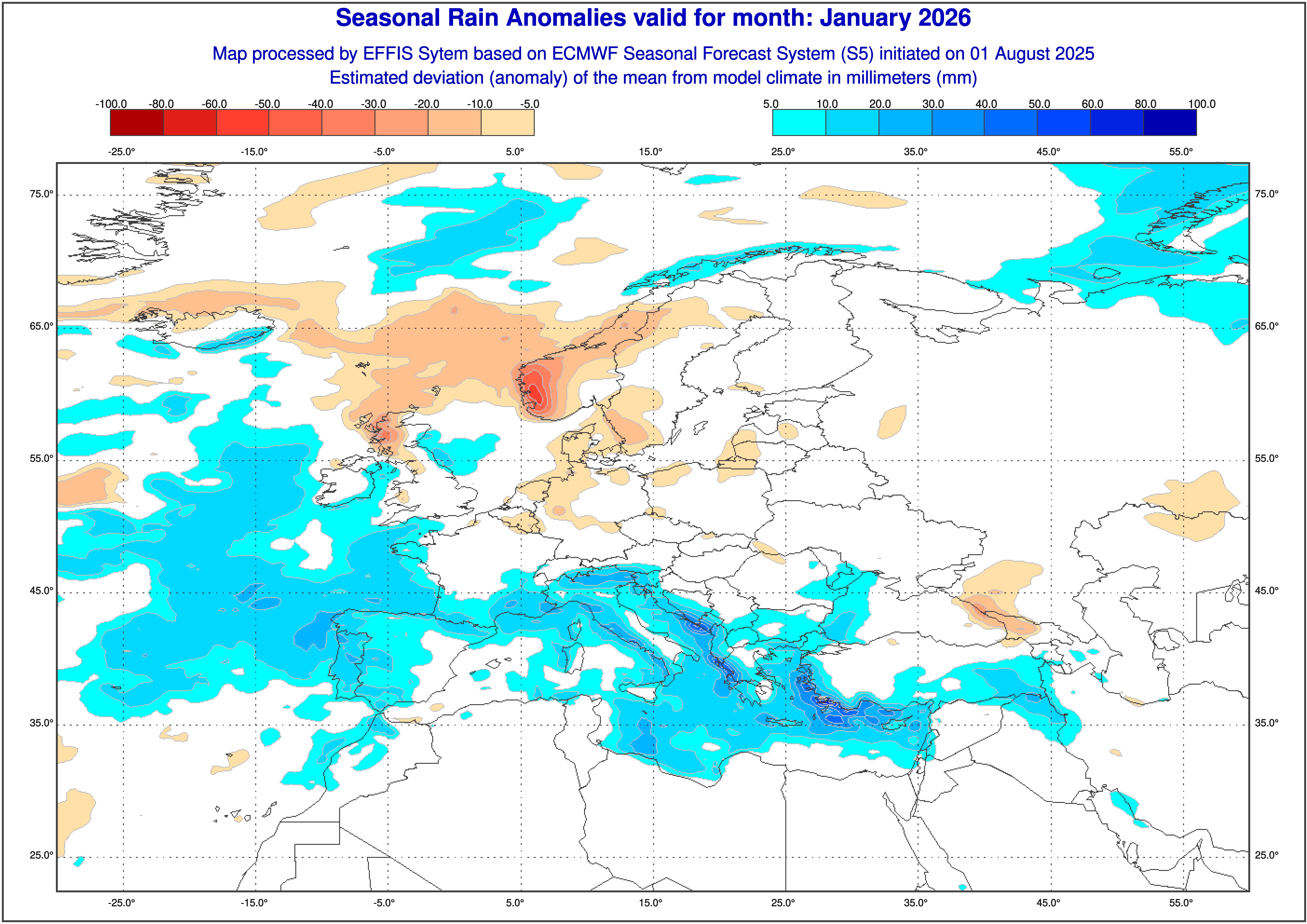 חורף 2025–2026 בישראל, לפי המודל האירופאי, צפוי להיות חם מהרגיל בכל ארבעת החודשים, עם חריגות טמפרטורה של עד 2 מעלות מעל הממוצע, בעיקר בנובמבר ובפברואר. מבחינת משקעים, נובמבר ודצמבר צפויים להיות מתחת לממוצע, ינואר עשוי להיות הגשום ביותר עם חריגות חיוביות ברורות, ואילו בפברואר צפויה ירידה מסוימת בפעילות, במיוחד בדרום.