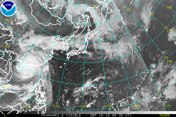 תמונת הלווין Himawari-8. משמאל טייפון מנגקוט נע לכיוון צפון מערב.