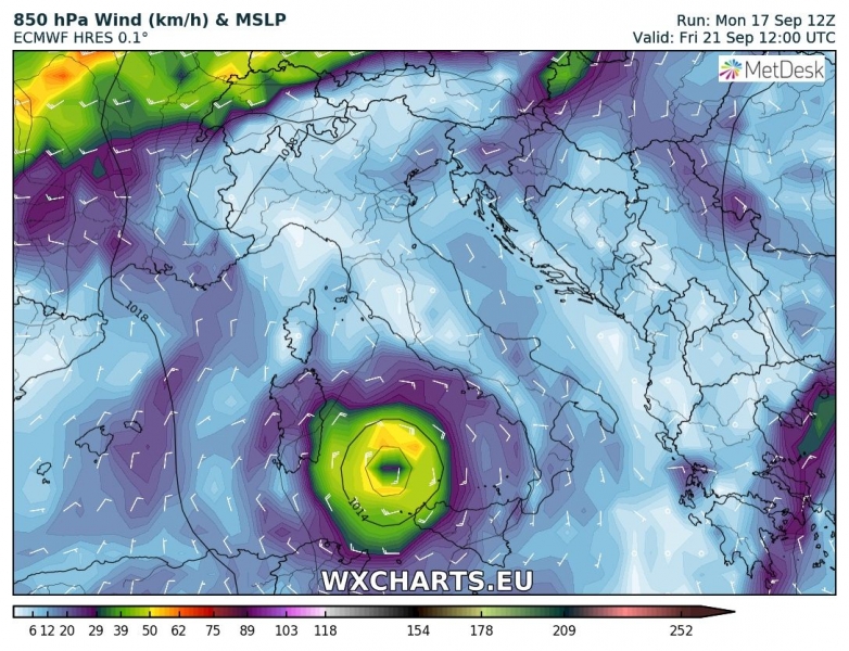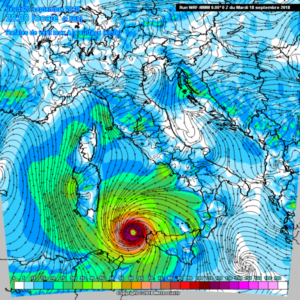 למטה, מפת המשקעים לשלושה ימים הקרובים על פי מודל GFS, מיום רביעי עד ליום שבת. צפי לגשמים כבדים באיזור סרדיניה, קורסיקה ודרום איטליה. עוצמת הגשם באיזור בפרק זמן קצר יכולה להעיד על סכנת שטפונות אפשרית באיזורים המוזכרים.