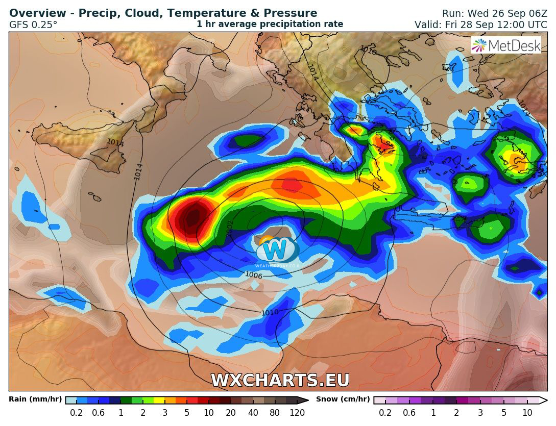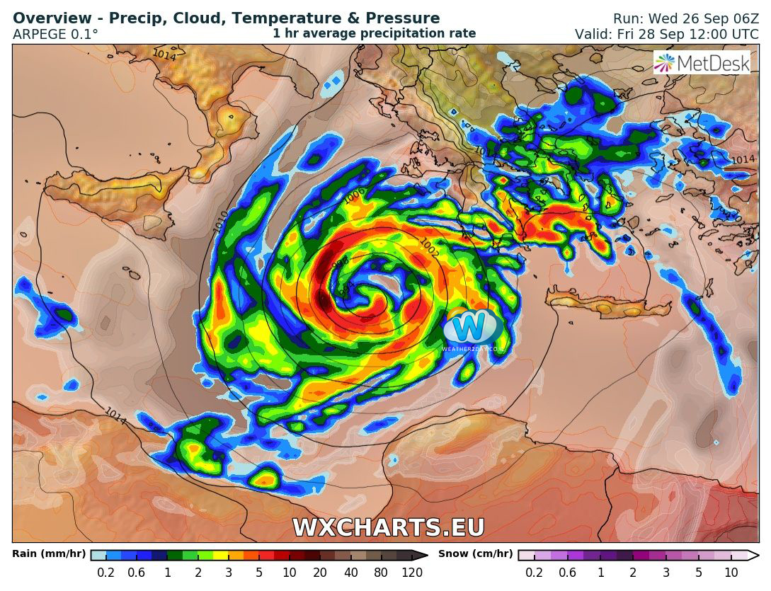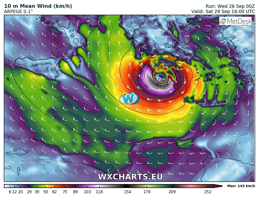 המודלים ממשיכים לדבוק בגרסא בה התפתחות מדיקן - סופת הוריקן ים תיכונית שתיווצר בים היוני, דרום מערבית ליוון ב-28/09 יום שישי, סופת המדיקן שזכתה לכינוי "זורבה" מסתמנת כהוריקן בדרגה 1. במידה ותפגע ביבשה בעוצמה זו, היא תגרום להצפות מקומיות ומשבי רוח סוערים, חלקם עשויים להיות מעל 150 קמ"ש. מזג אוויר זה נחשב למסכן חיים ועלול לשבש טיסות ולגרום לנזקים.