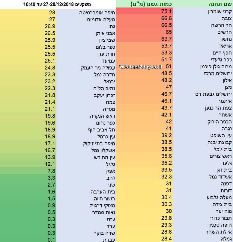 מזג האוויר הצפוי הלילה (שישי): מעונן לרוב. גשמים מקומיים צפויים לרדת בעיקר במרכז הארץ ובצפון הנגב. מחר (שבת): מעונן. גשמים מידי פעם ירדו בצפון הארץ ובמרכזה. ייתכנו סופות רעמים יחידות. יוסיף להיות קר מהרגיל לעונה. קיים חשש קל משטפונות בנחלי מדבר יהודה, ים המלח ובבקעת הירדן. בחרמון ירד שלג.
