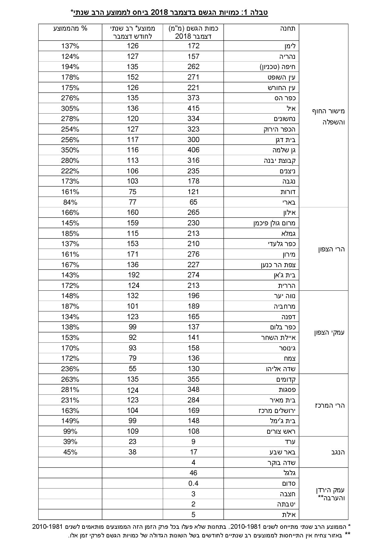 השירות המטאורולוגי פרסם היום את סיכום חודש דצמבר לשנת 2018. על פי הסיכום חודש דצמבר היה גשום מהממוצע במידה ניכרת בצפון הארץ ובמרכזה. כעת השירות המטאורולוגי מאשר זאת ואם הרגשתם שהיה הרבה גשם - לא טעיתם. על פי הסיכום אירוע הגשם המשמעותי שהקפיץ את כמויות המשקעים כלפי מעלה התרחש בתחילת החודש (6-8/12) ואחראי על מחצית מכמויות הגשמים שירדו במהלך החודש. כמויות הגשמים היו בולטות במיוחד במישור החוף, חלק מהתחנות חצו את ה-200 מ"מ באותו אירוע נדיר.