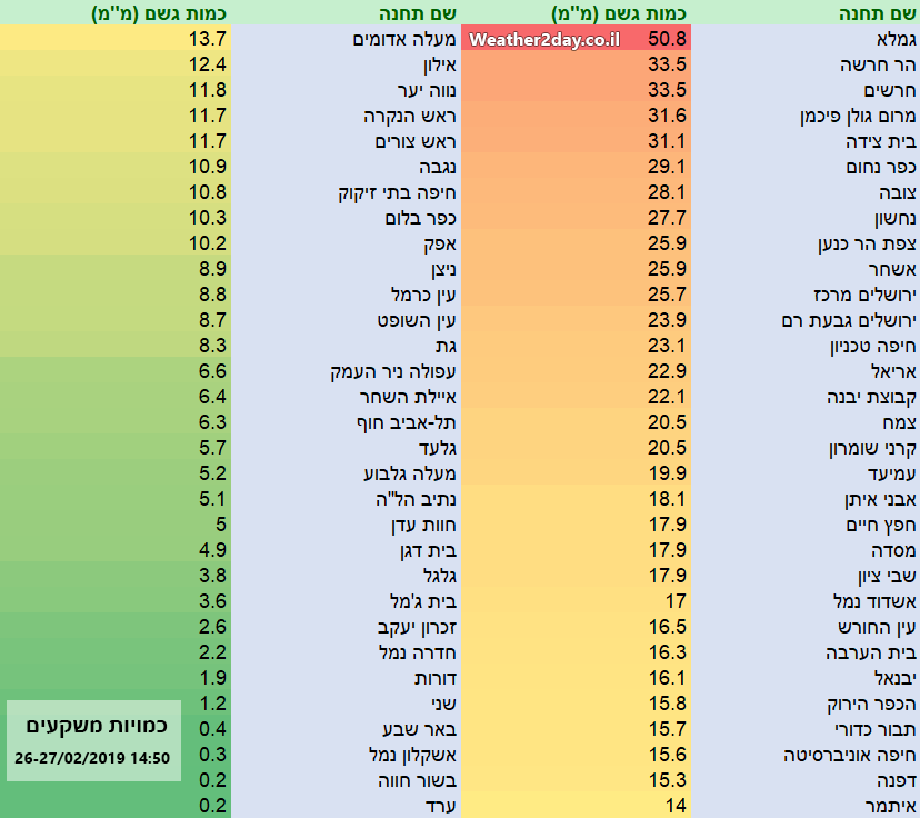 טבלת המשקעים מתחילת המערכת ועד השעה 14:50 מראה כמויות יפות של גשם בעיקר בצפון הארץ