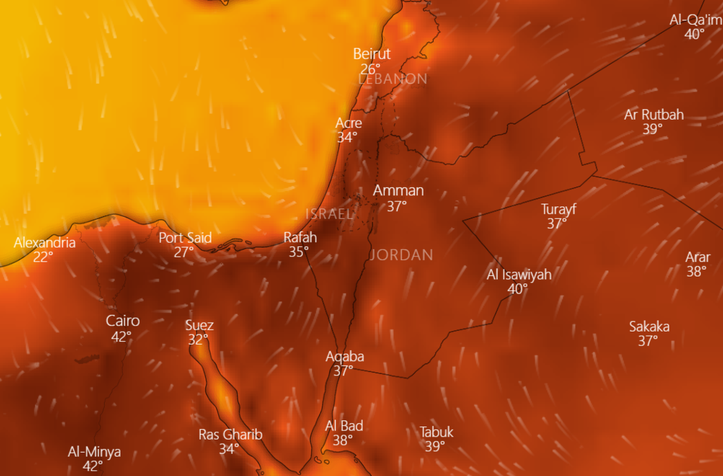 הטמפרטורות יעלו בהדרגה כבר מיום רביעי, בו ימדדו יותר מ-35 מעלות ברוב האיזורים, למעט איזורי החוף. חמישי ושישי מסתמנים כימים המסוכנים יותר בגל החום הזה, הטמפרטורות יעלו למעל 40 מעלות ברוב איזורי הארץ, בבקעת הירדן והערבה צפי לטמפרטורות קיצון שעשויות לעבור את ה-46 מעלות. אפילו איזורי החוף שנהנים מטמפרטורות נוחות בתקופה זו בזכות הים הקר יאלצו להתמודד עם טמפ' סביב ה-40 מעלות.