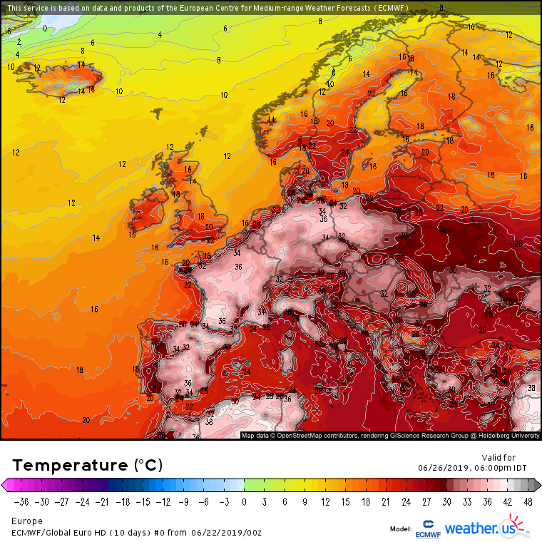 ימים בודדים אחרי שהחל הקיץ גל חום צפוי להכות ברחבי מרכז ומערב אירופה, ההתחממות תימשך לפחות עד לסוף השבוע (29/06) באיזורים שונים בצרפת ובדרום אנגליה, הטמפרטורות יגיעו ל-36 עד 40 מעלות צלזיוס. החום צפוי להתפשט בהדרגה למדינות נוספות במערב אירופה.