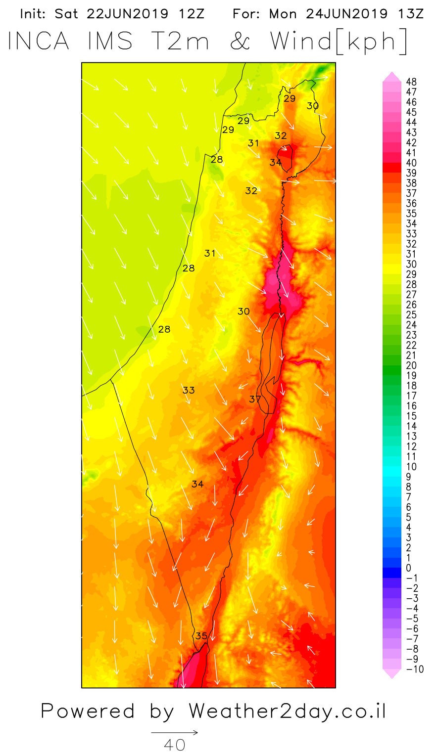 ועכשיו לראשונה אנו מציגים את מפות הטמפרטורה והלחות החזויות ממודל INCA המורץ ע"י השירות המטאורולוגי ומשמש לחיזוי לטווח קצר: