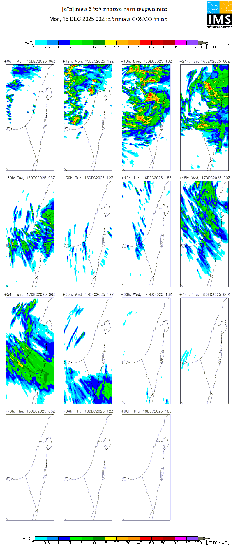 תחזית גשם של המודל האיזורי קוסמו. כל מפה מציגה את כמות הגשם החזויה ל-6 שעות. הקובץ מתעדכן פעמיים ביום, ב-13:00 בצהריים וב-01:00 בלילה. התחזית הינה לשלושת הימים הקרובים. נתונים: השירות המטאורולוגי