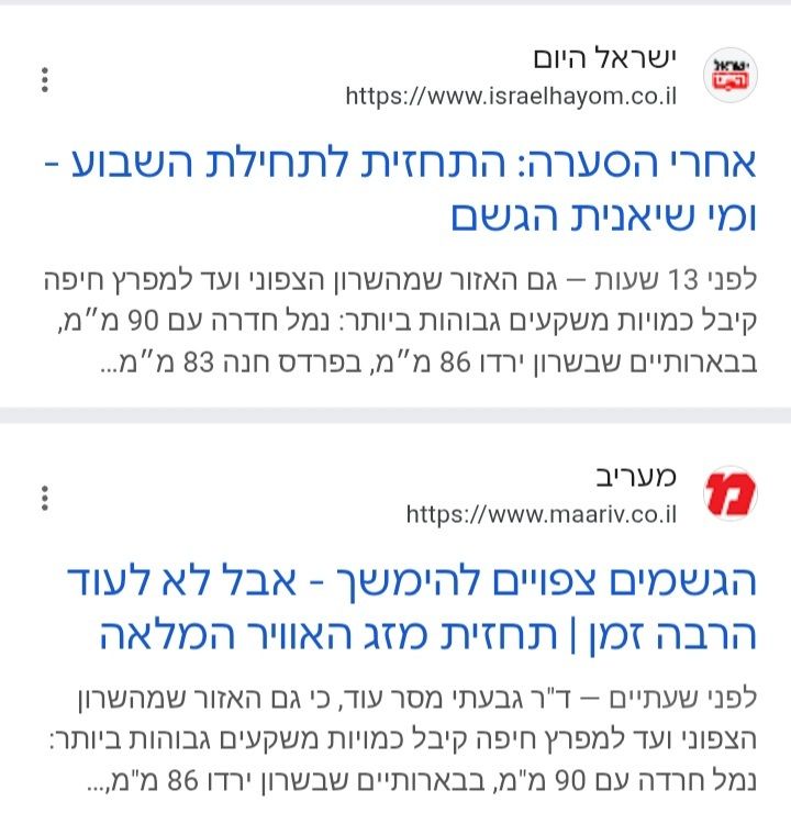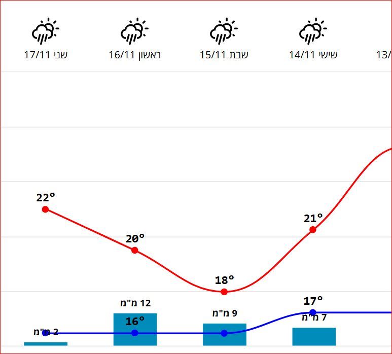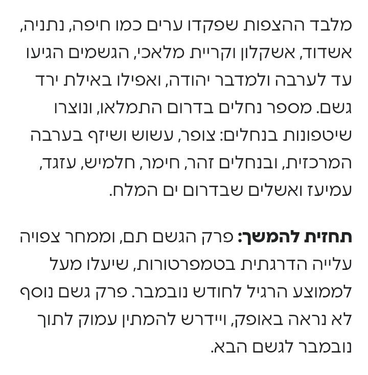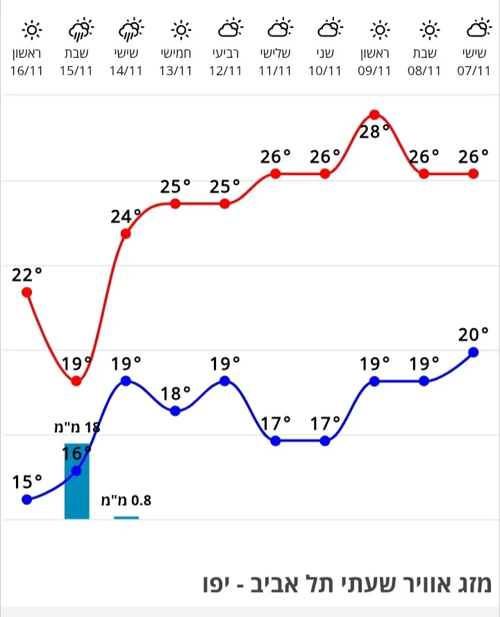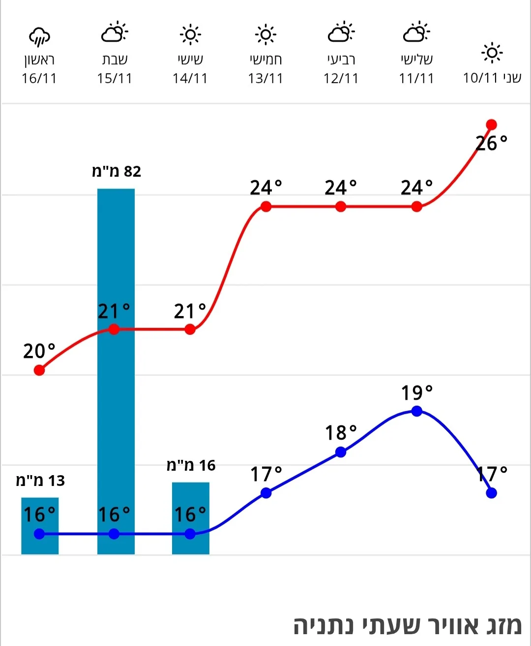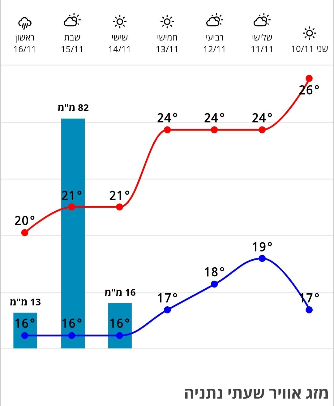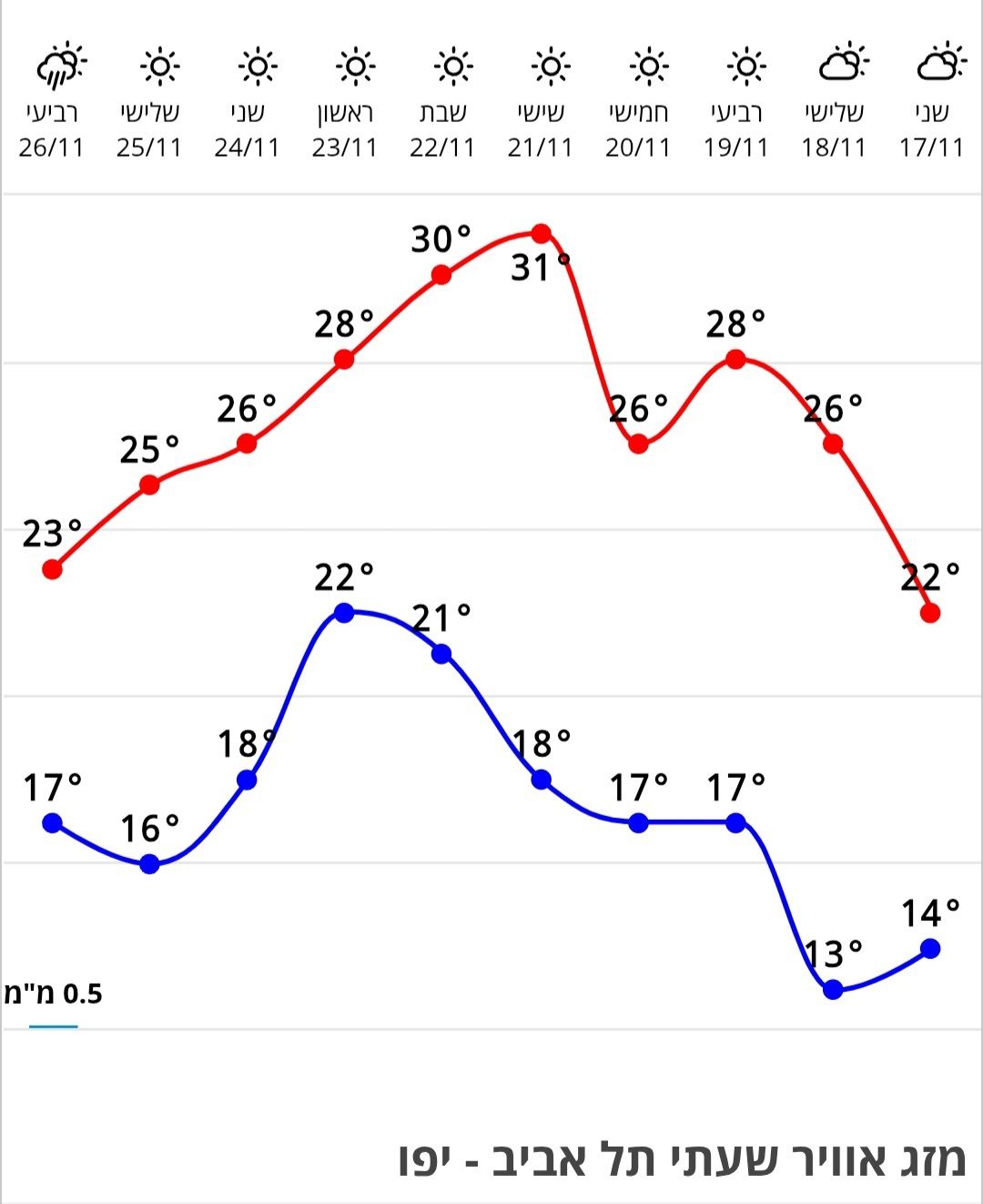 אגב על פי תחזית האתר אחרי המערכת נכון לעכשיו בסוף השבוע הבא, הטמפרטורות מטפסות לשוב מזג אוויר שרבי. 28 מעלות בנתניה, זה בטוח ירגיש כמו 34 וזה נובמבר.
