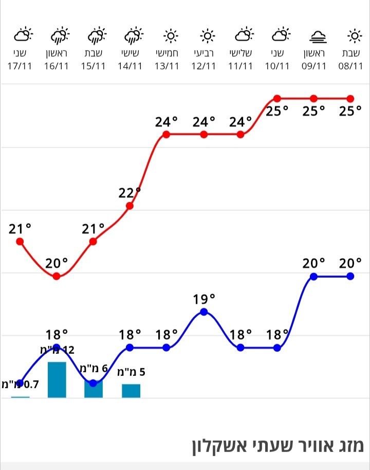 שבת ( 08.11.25 ) : בהיר עד מעונן חלקית בעננות גבוהה ואביך, הטמפ' ירדו מעט אך יוסיפו להיות גבוהות מהרגיל לעונה, יהיה חם מהרגיל עד שרבי ברוב חלקי הארץ. הרוח בפנים הארץ מכיוונים שונים מזרחית עד צפון מערבית קלה עד מתונה ובמישור החוף צפונית מתונה עד ערה.