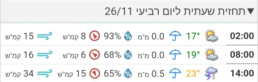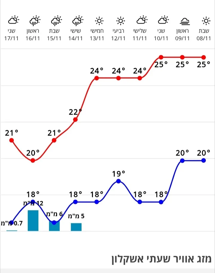 יום רביעי ( 12.11.25 ) : מעונן חלקית בעננות משתנה בעיקר גבוהה עדיין צפוי אובך קל, הטמפ' ירדו עוד ירידה קלה והם עדיין יהיו גבוהות מהרגיל לעונה. הרוח צפון מערבית מתונה.