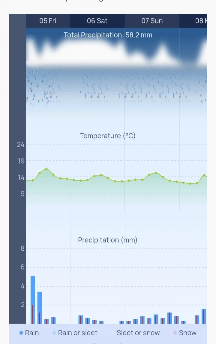 יום שישי ( 05.12.25 ) : מעונן חלקית עם כמויות משתנות של עננות בינונית בעיקר, אשר משעות אחה"צ אל תוך הערב והלילה יכולה לטפטף או להוריד גשם קל ומלוכלך, צפוי אובך, ינשבו רוחות צפון מזרחיות עד מזרחיות חזקות מאוד בעיקר בצפון הארץ ובהרים, הטמפ' ביום זה יעלו עוד והם יהיו גבוהות מהרגיל במידה ניכרת, יעשה שרבי ברוב חלקי הארץ.