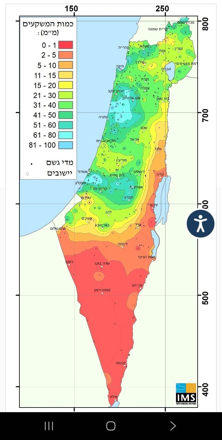 אני מעלה עריכה של מפת המשקעים המצטברת של קוסמו. כל מה שמעל 50 מ"מ נצבע בסגול, זאת אומרת סקלות צבעים שונות עברו איחוד. אתה יכול לראות ש90 אחוז מהמדינה איפה שיש לך 500 מ"מ שנתי מחוץ לשטח זה. הממוצע לנובצבר בשטח זה בין 50 ל80 מ"מ.