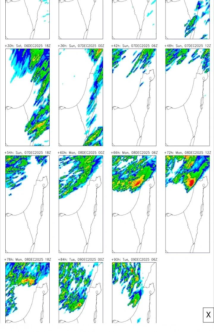 שבת ( 06.12.25 ) : עד שעות לפני הצהריים רוחות מזרחיות חזקות והאובך יתגבר ויהיה כבד, עד שעות הצהריים עדיין צפוי להיות חם מהרגיל במידה ניכרת, יהיה מעונן חלקית בעננות בינונית שיכולה לטפטף או להוריד גשם קל ומלוכלך, משעות הצהריים אל תוך הערב והלילה הרוחות יחוגו לדרום מערביות, הטמפ' ירדו, העננות תתרבה ותתעבה וממטרים מקומיים מלווים סופות רעמים וברד יכולים לרדת בכל מקום בארץ, משעות הצהריים קיים חשש חמור ביותר לשיטפונות בכל נחלי הדרום ומזרח הארץ והצפות במקומות המועדים.