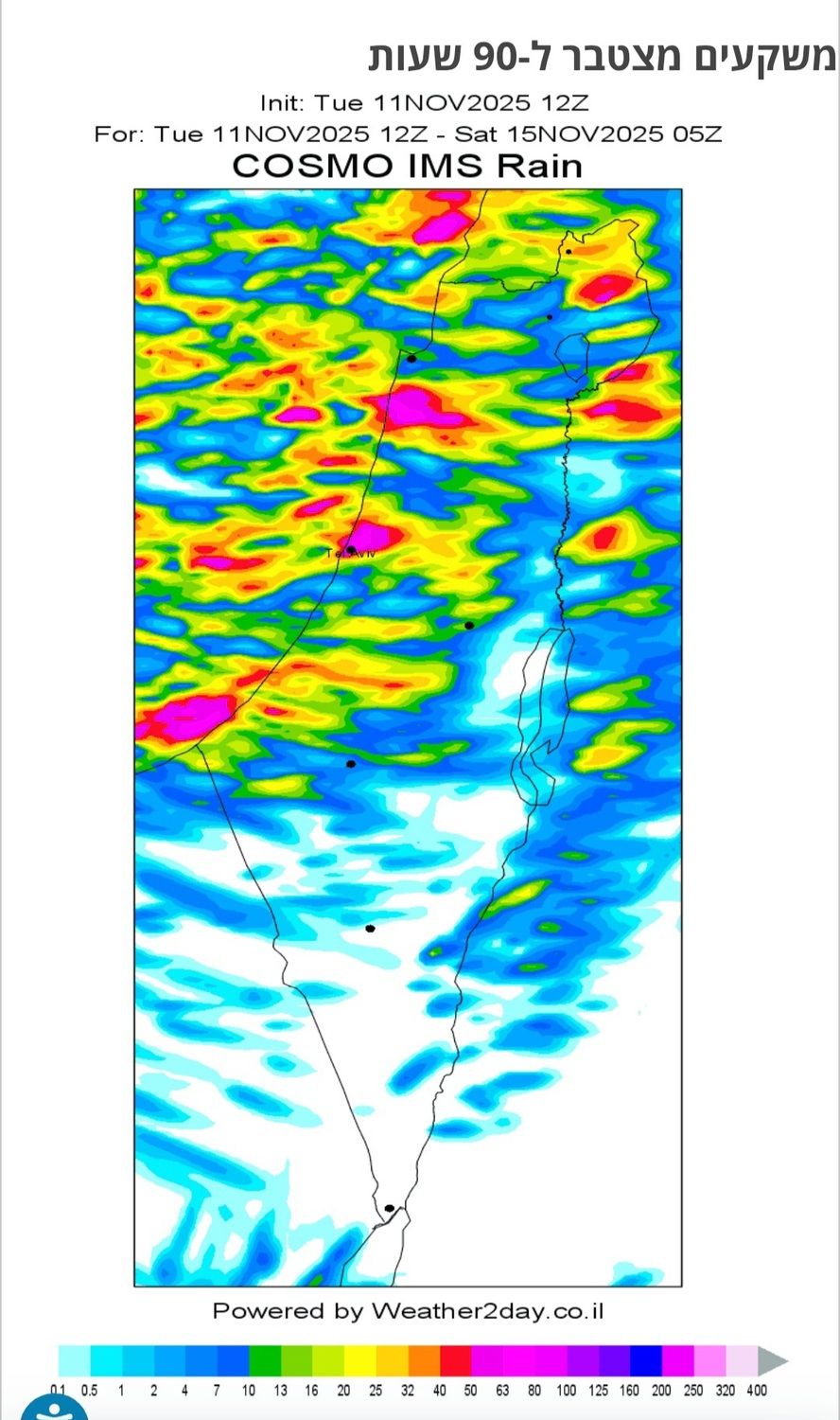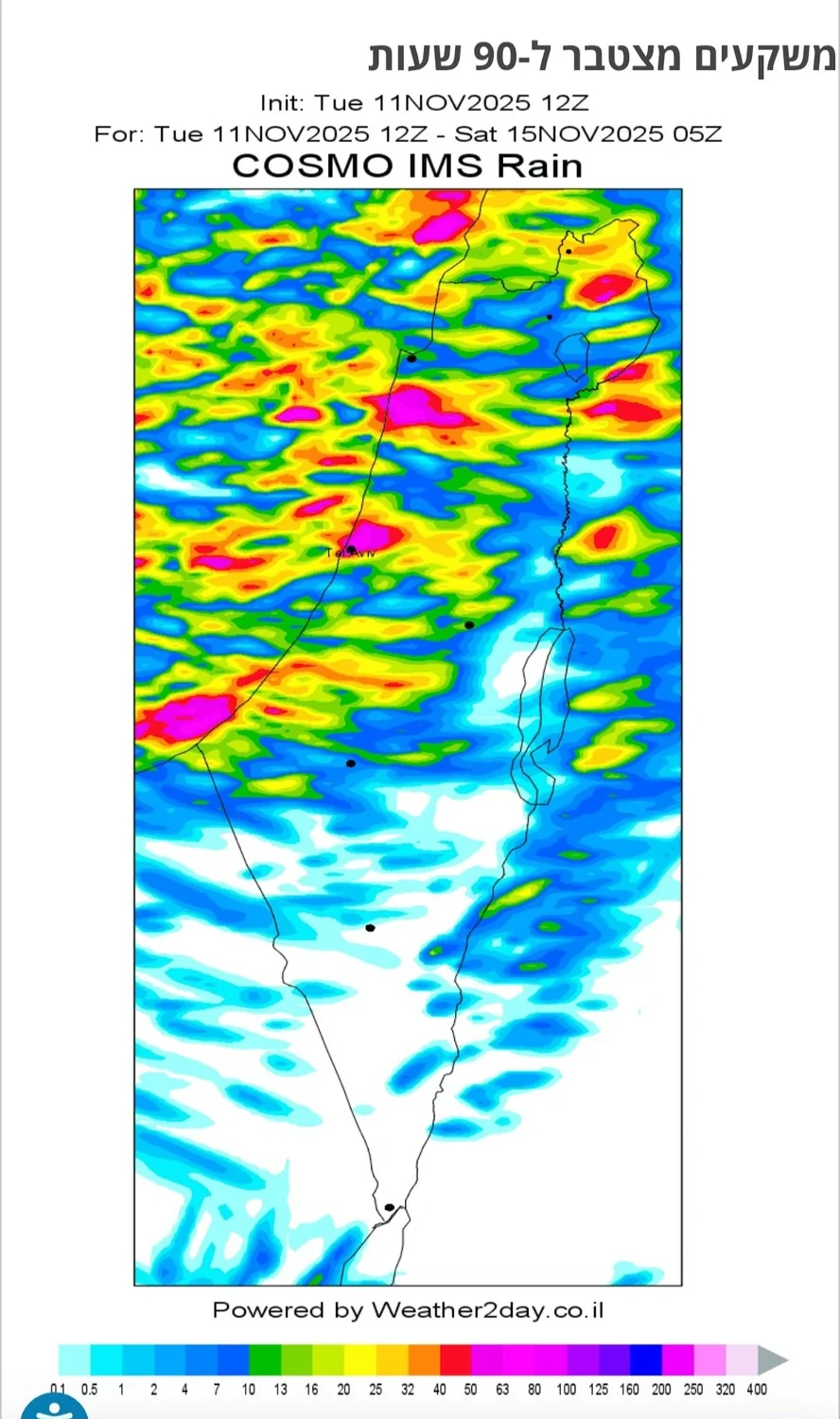שים לב שיש לך הפרש משמעותי בין תחנות שונות בחוף. יש תחנות שהצפי לפי קוסמו הוא 100 מ"מ אבל אזורים הרבה יותר נרחבים עם צפי פחות. בממוצע ארצי מדרום מישור החוף לירושלים וצפונה הוא לא כזה מרשים. אני לא רוצה להיכנס לחישובים, אבל קוסמו הערב עם ממוצע מרחבי של 30 מ"מ בערך. תחשוב שהצבע האדום במפה שמופיעה פה באתר זה 40 מ"מ פלוס ויש לך נקודות בודדות עם הסקלה הזו ומעלה. הייתי נדיב עם ה30 מ"מ. זו מערכת של בערך חצי נובמבר.