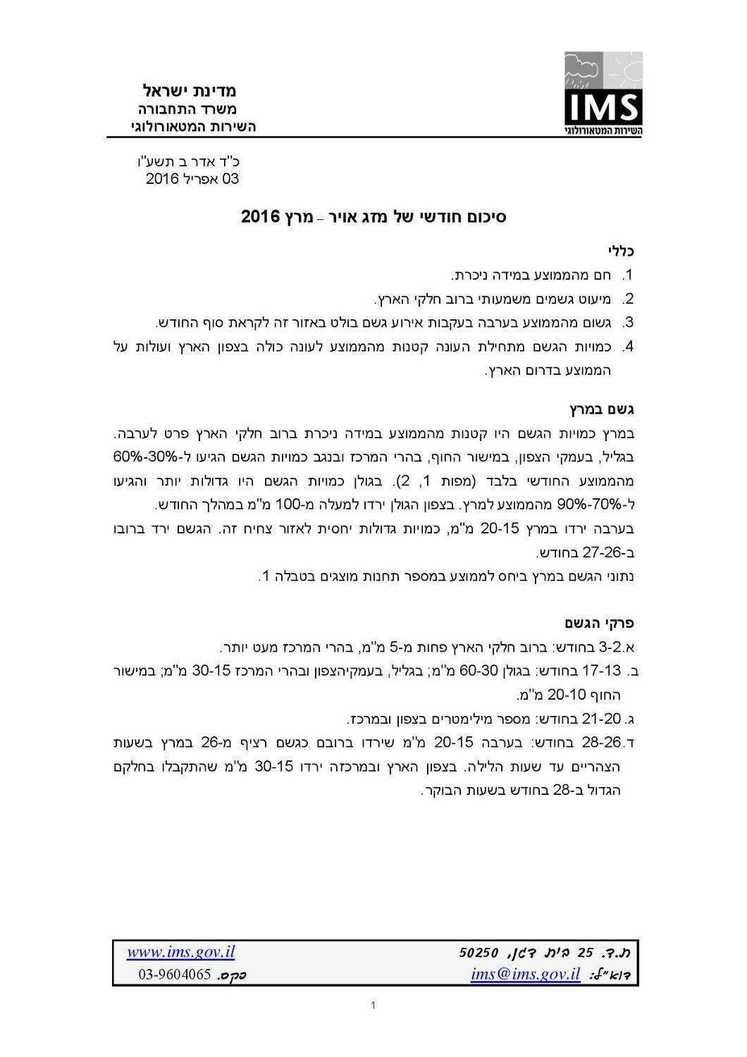 סיכום חודש מרץ 2016 באדיבות השירות המטאורולוגי